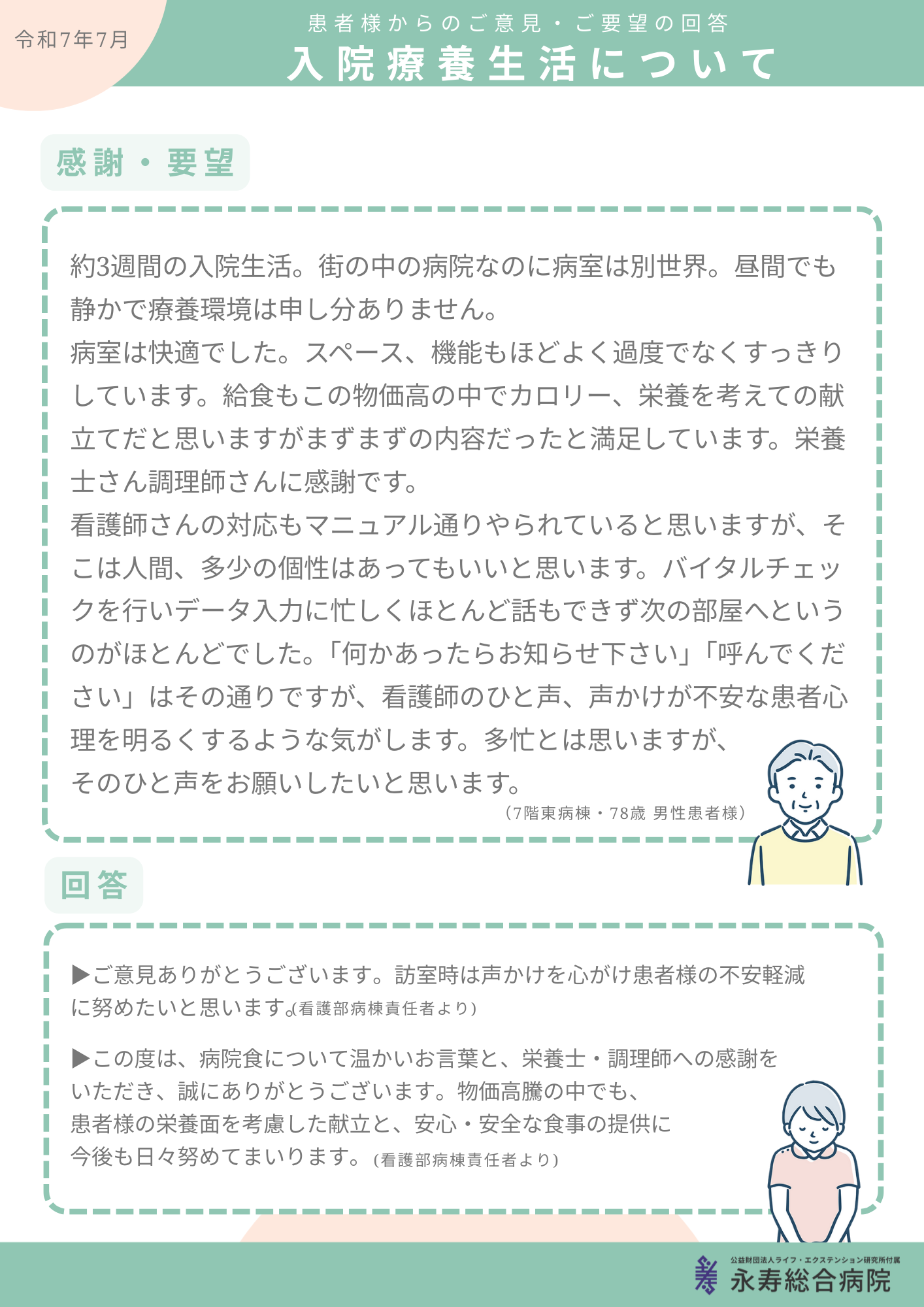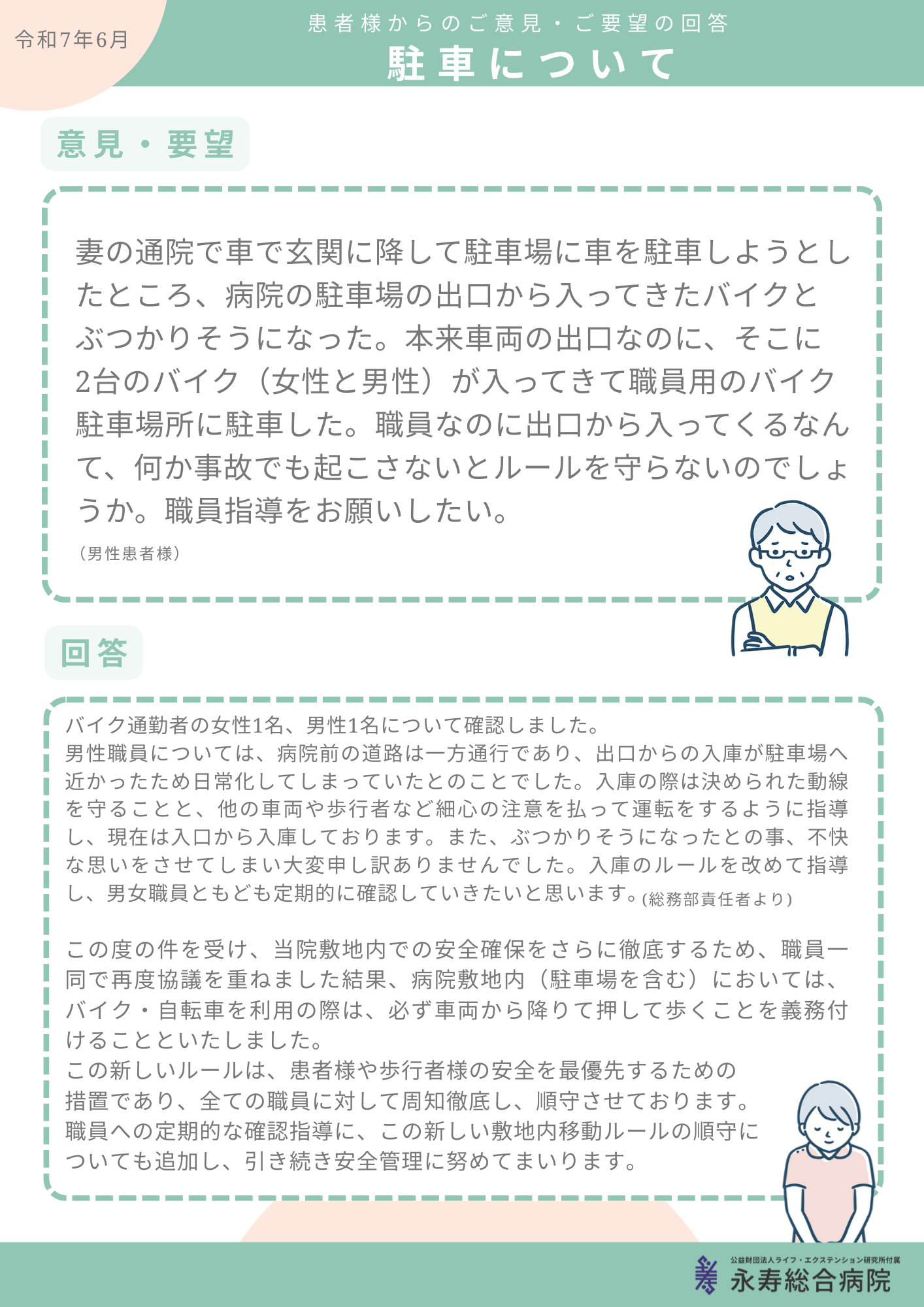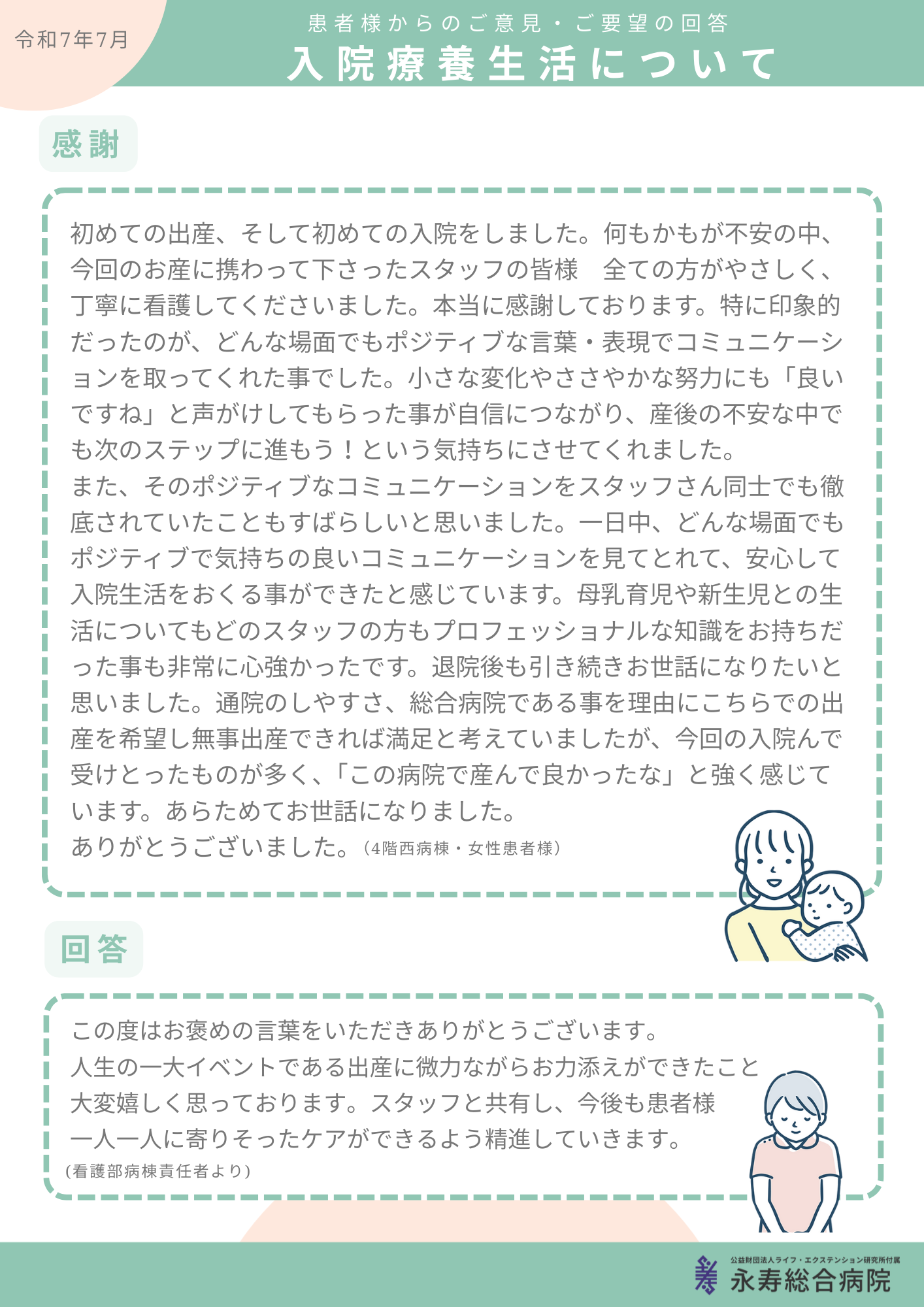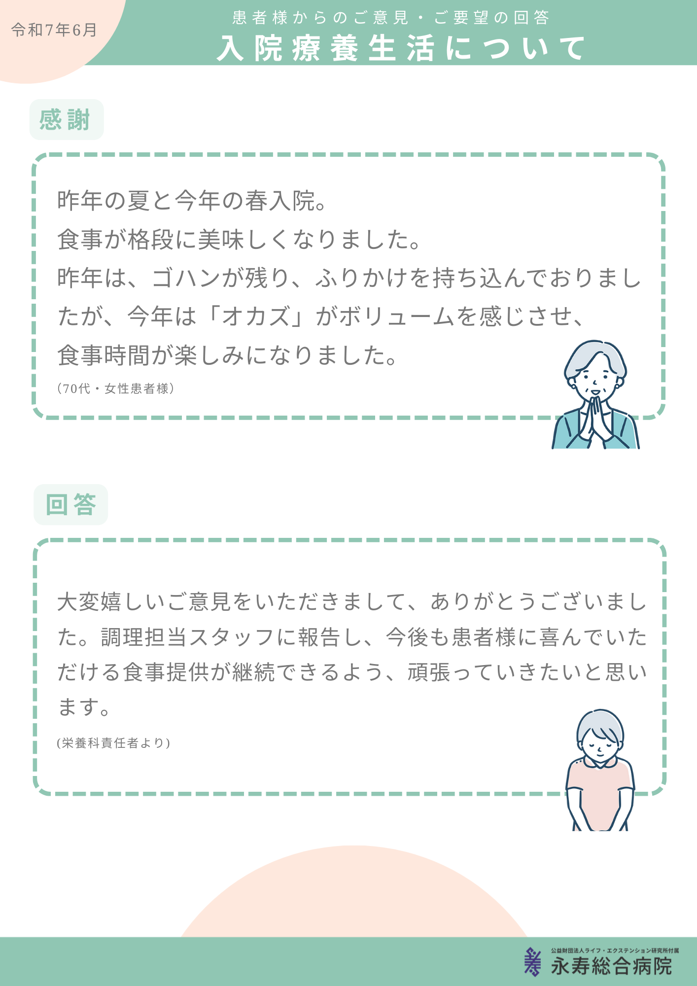 これまでに皆さまからいただいたご意見について、院内の掲示板及びこちらのホームページにて一部ご紹介いたします。(お名前・ご住所等の個人情報は掲載いたしません。)