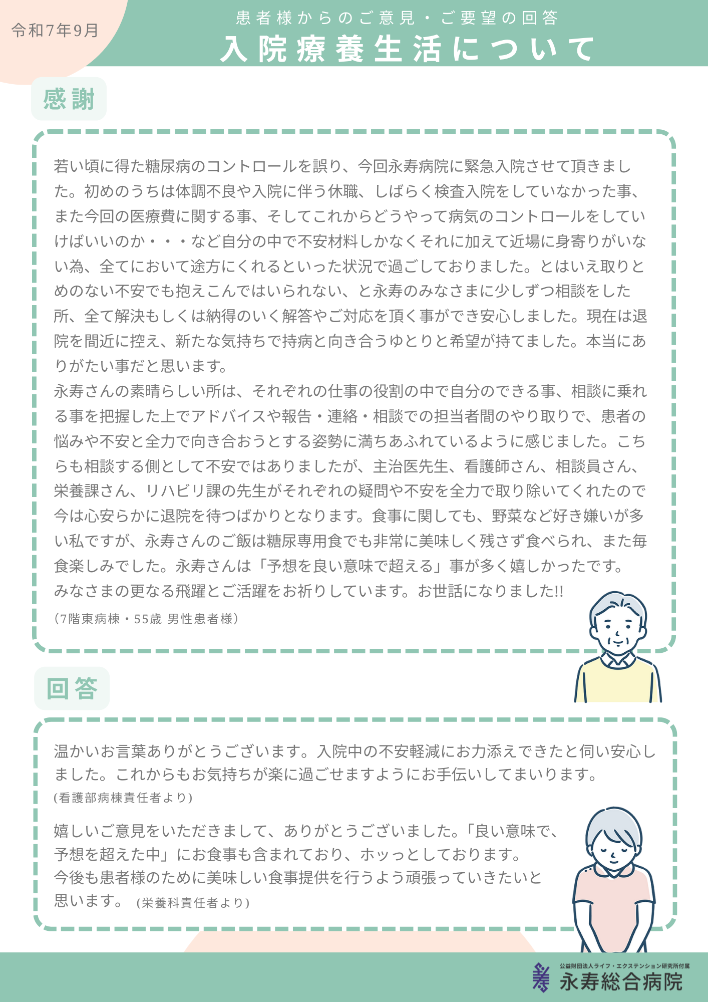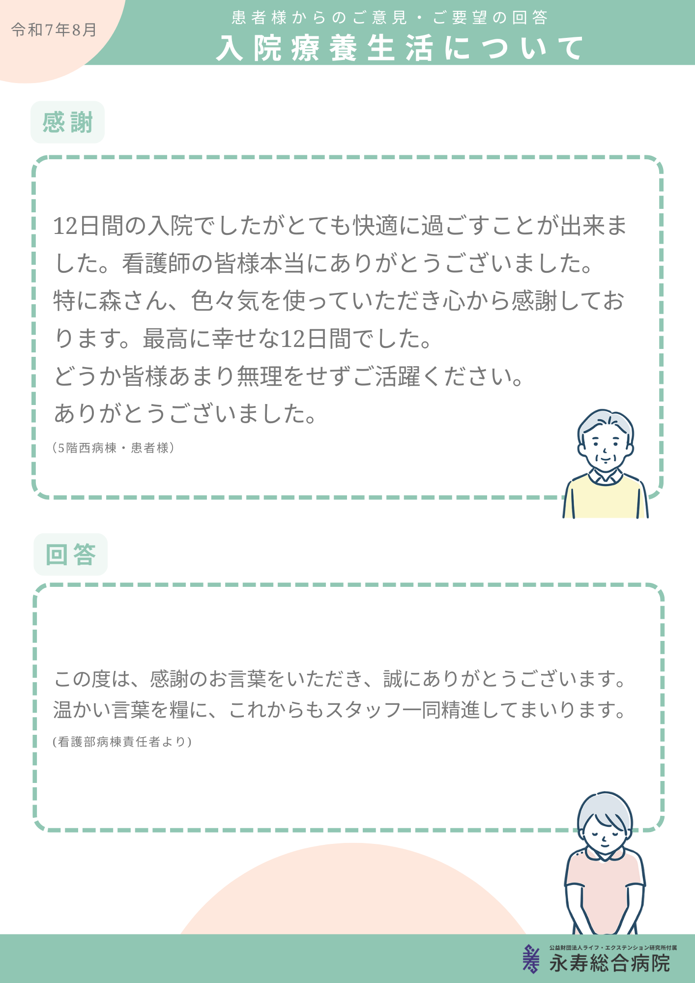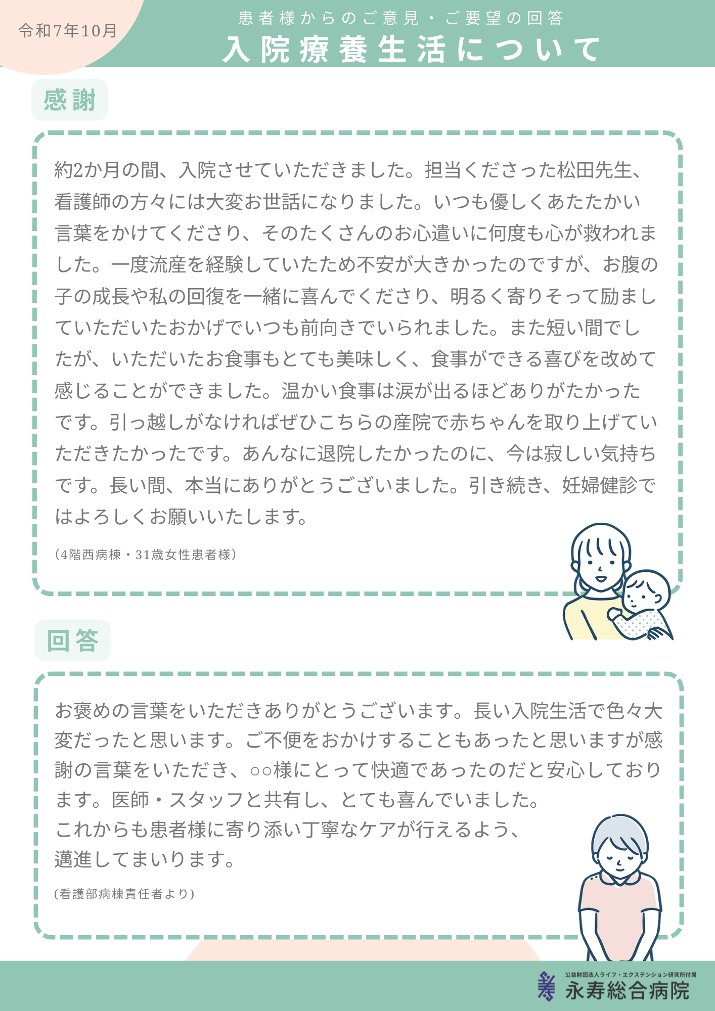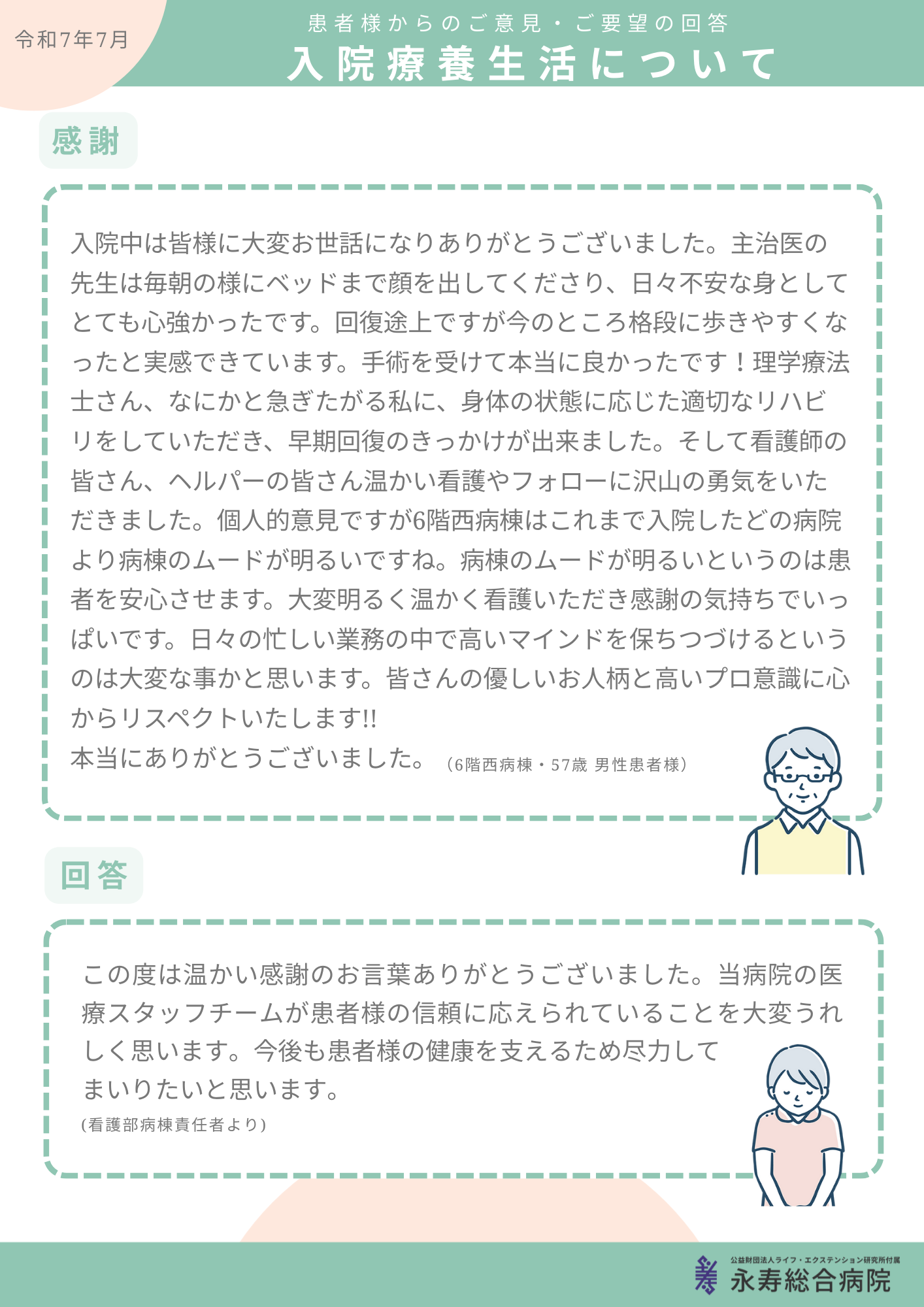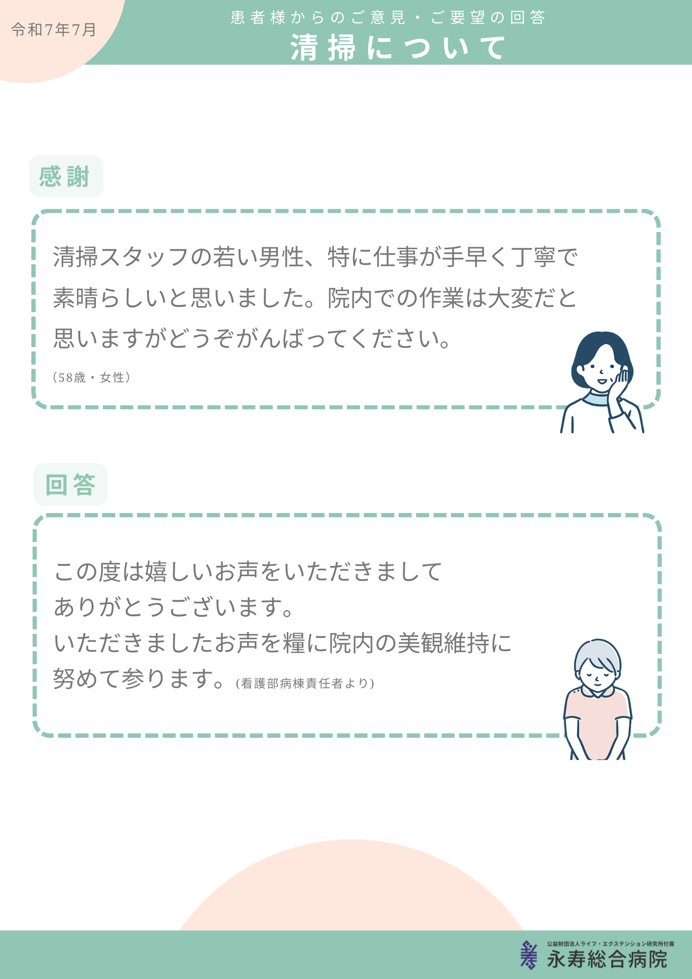 これまでに皆さまからいただいたご意見について、院内の掲示板及びこちらのホームページにて一部ご紹介いたします。(お名前・ご住所等の個人情報は掲載いたしません。)