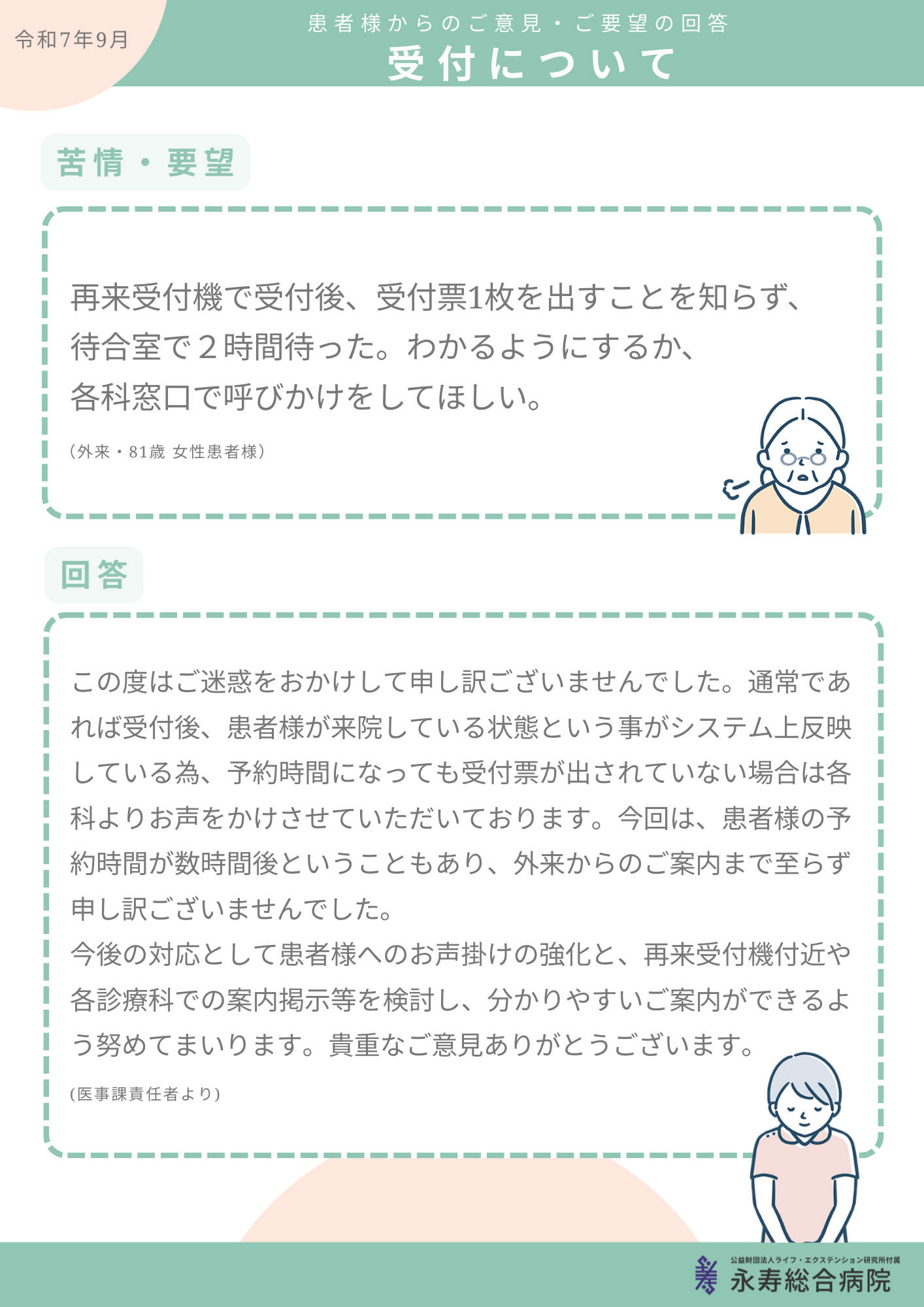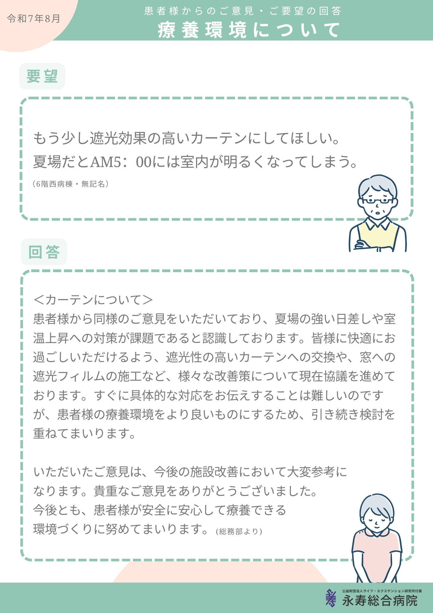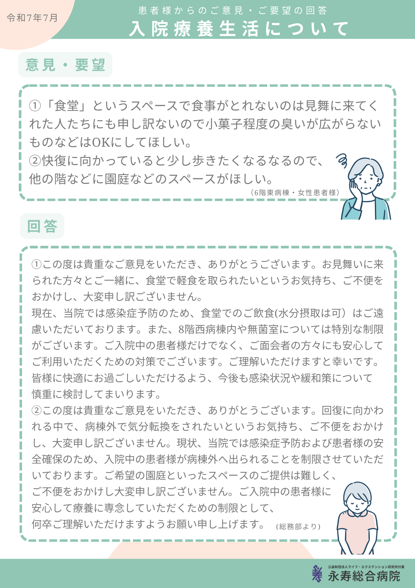 永寿総合病院では、病院の運営改善のために院内に意見箱を設け、患者さまやご家族の皆さまからのご意見・ご要望を広く募っております。