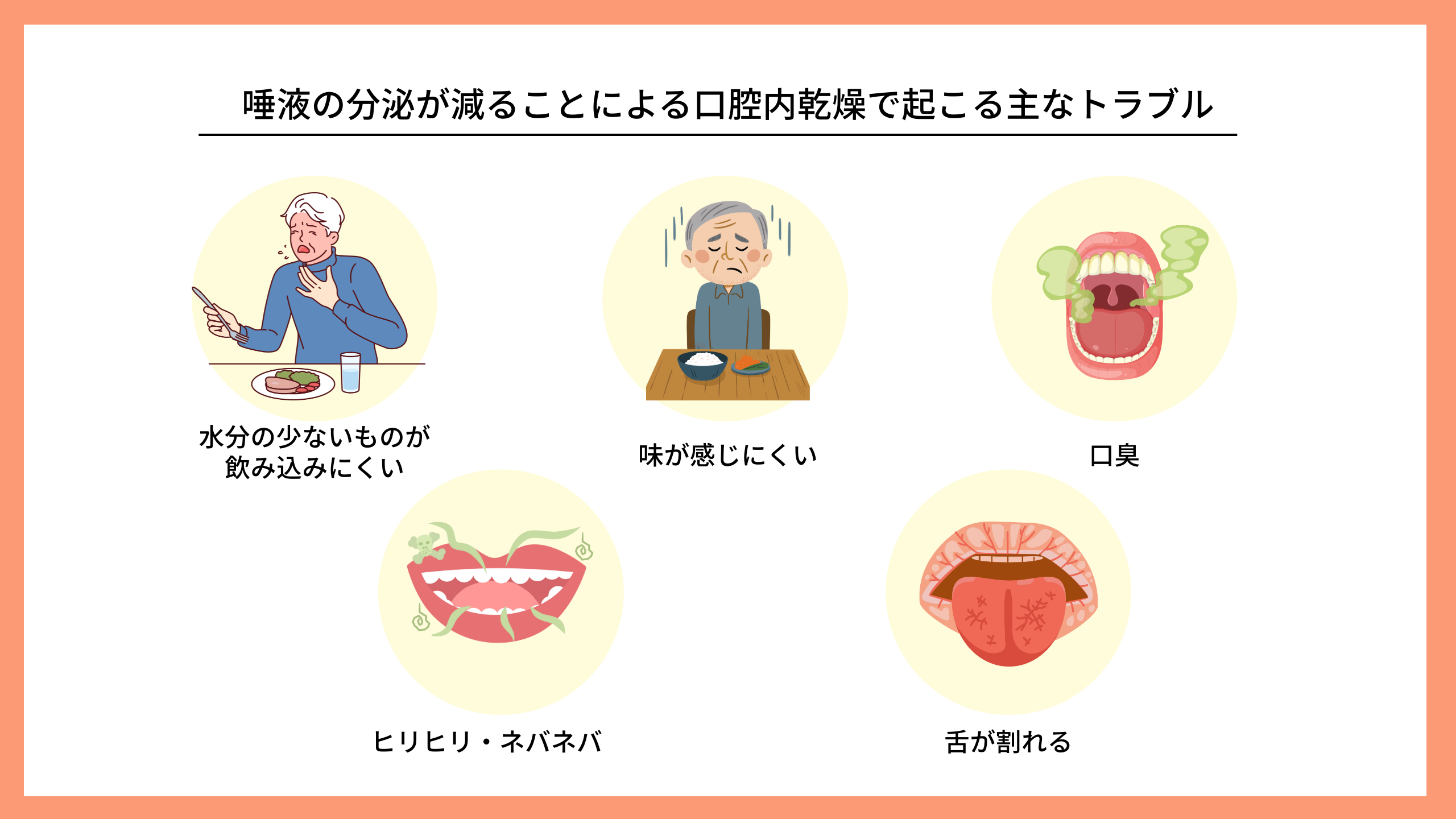 口腔内が乾燥すると唾液の働きが妨げられ、舌の運動機能も低下し、誤嚥などの摂食嚥下障害につながる危険性があります。