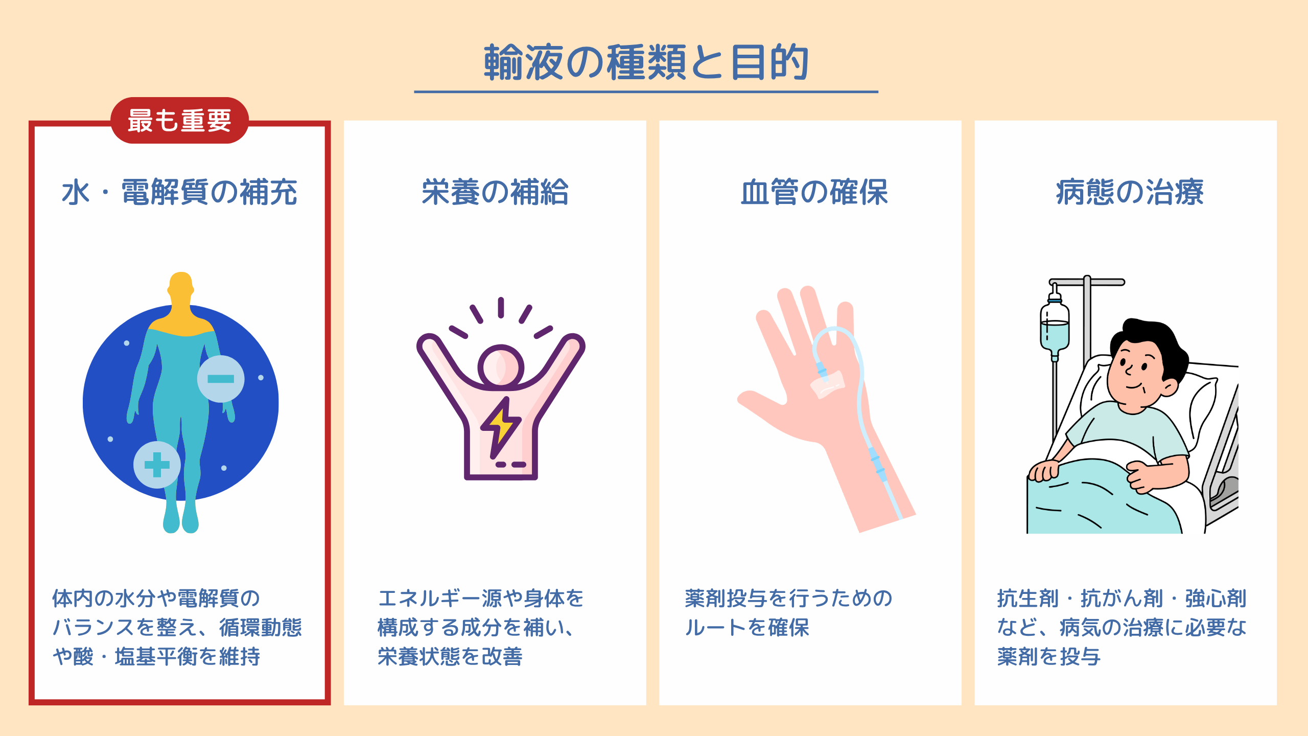 様々な種類の輸液を、患者さんの状態や目的に応じて使い分ける必要があり、ひとつひとつの特徴をしっかり理解しておくことが大切です。