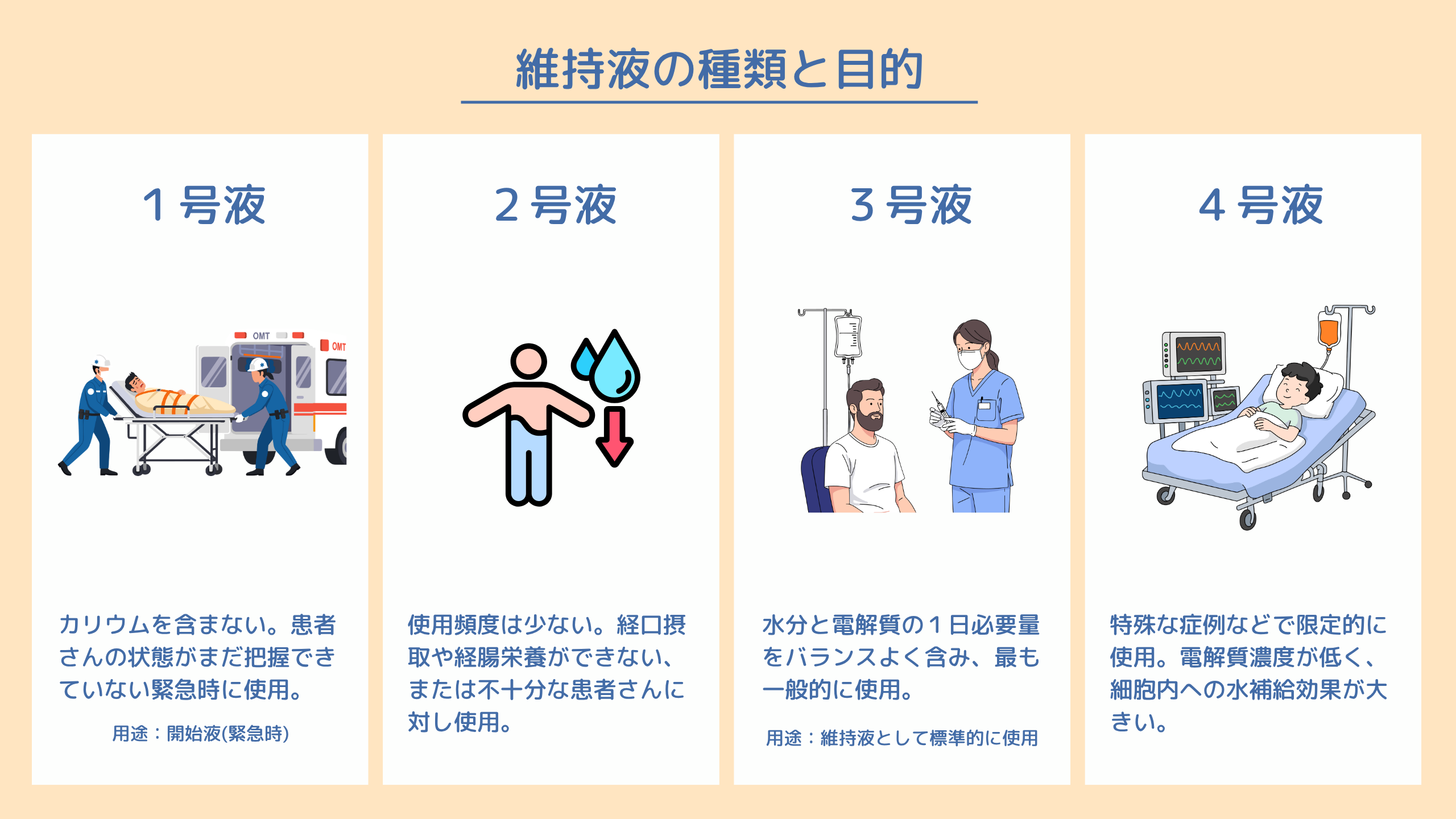 「維持液」は、食事がとれない方や脱水状態の方などに使用される、細胞内まで水分と栄養を届ける輸液です。維持液には1号~4号までの種類があり、目的や患者さんの状態に合わせて選択されます。