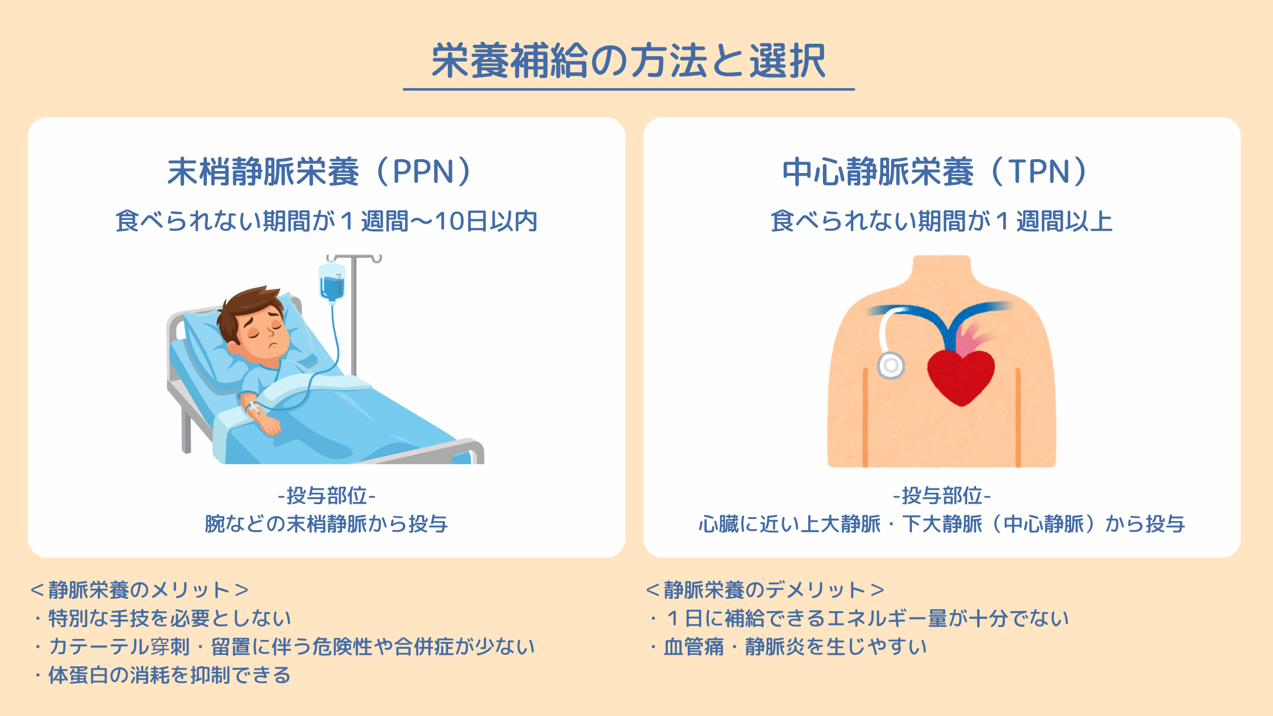 原則として経腸栄養が不可能な場合や、中心静脈栄養が有利な場合にのみ適応されます。