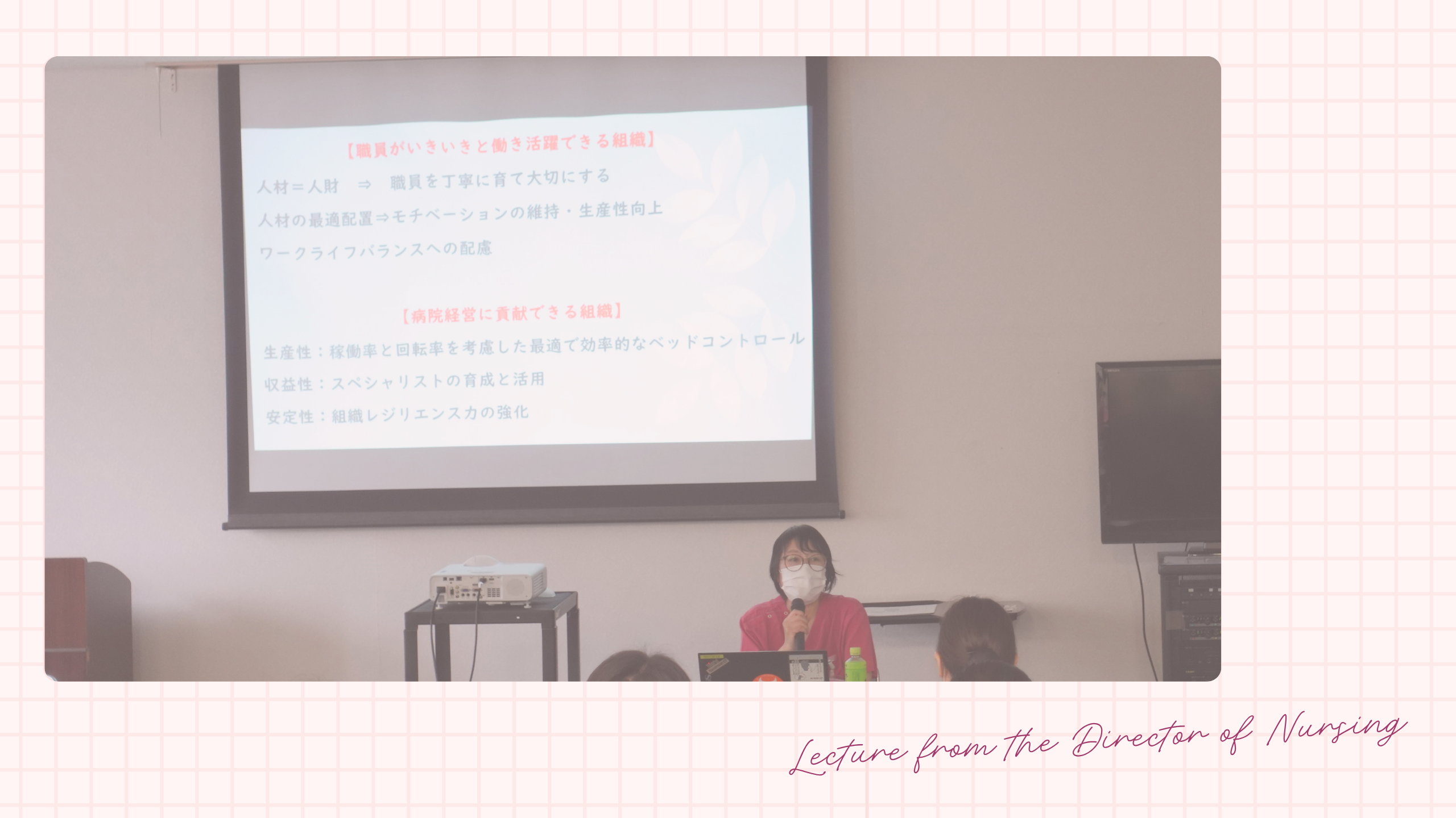看護部長による病院と看護部の概要についての講話では、新しい入職者の皆さんにむけて、台東区の特徴、これからどんな環境でお仕事にあたることになるのかなどのくわしいお話に始まり、当院の特徴、台東区においての役割などを教えていただきました。