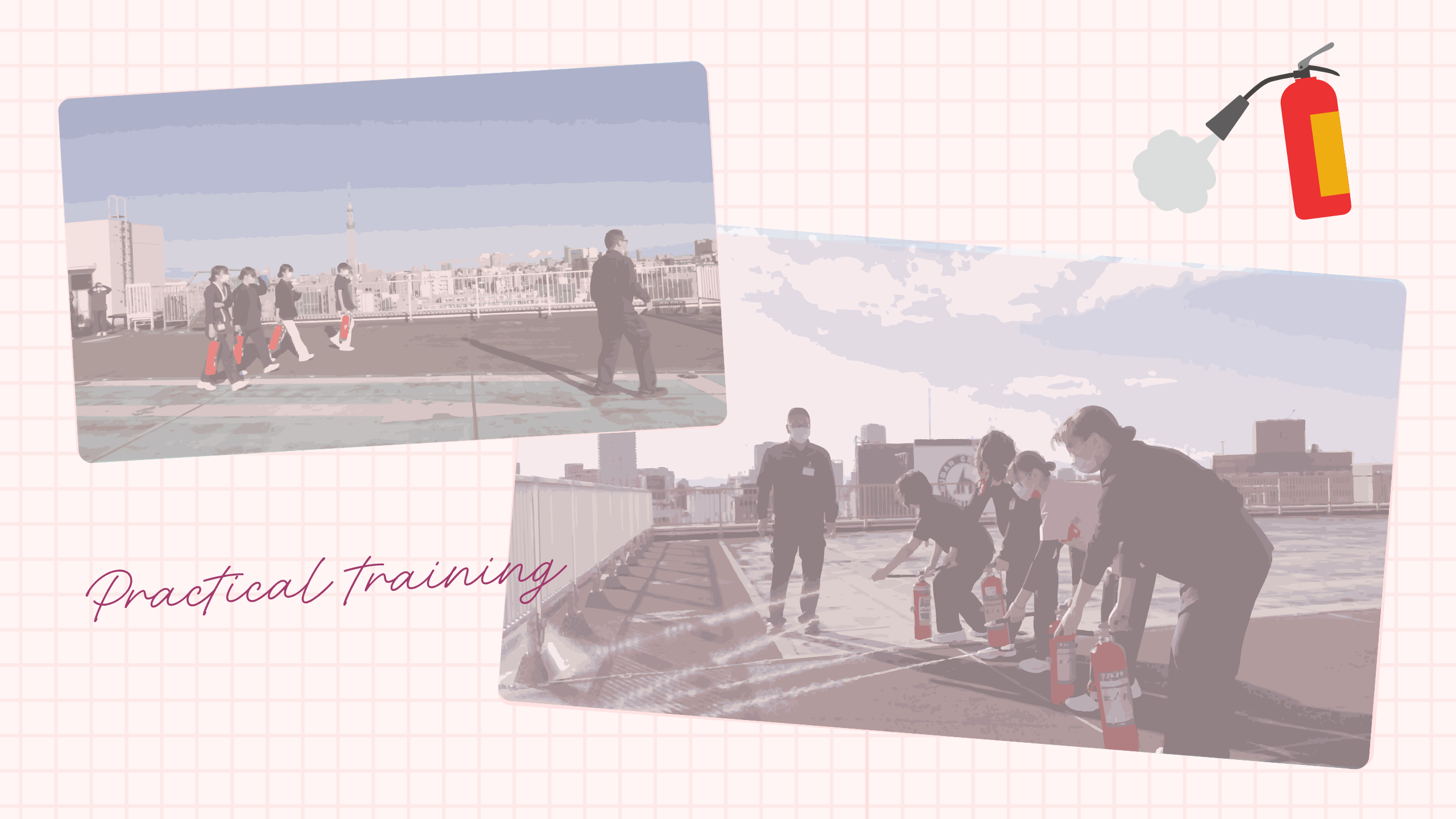 朝から降っていた雨が上がった事もあり、午後の研修のひとつ「防火・防災について」の防火訓練は屋上のヘリポートで行うことができました。