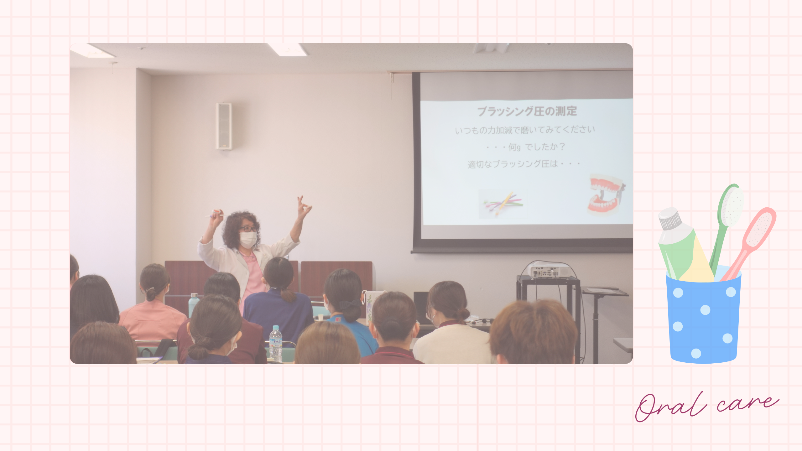 口腔内細菌による感染予防の観点から、日々のケアの重要性を学びました。患者さんのセルフケア力を高める関わりとして、ブラッシングの習慣化や、難しい場合にはうがいを取り入れるなど、無理なく継続できる方法を考えていきましょう。