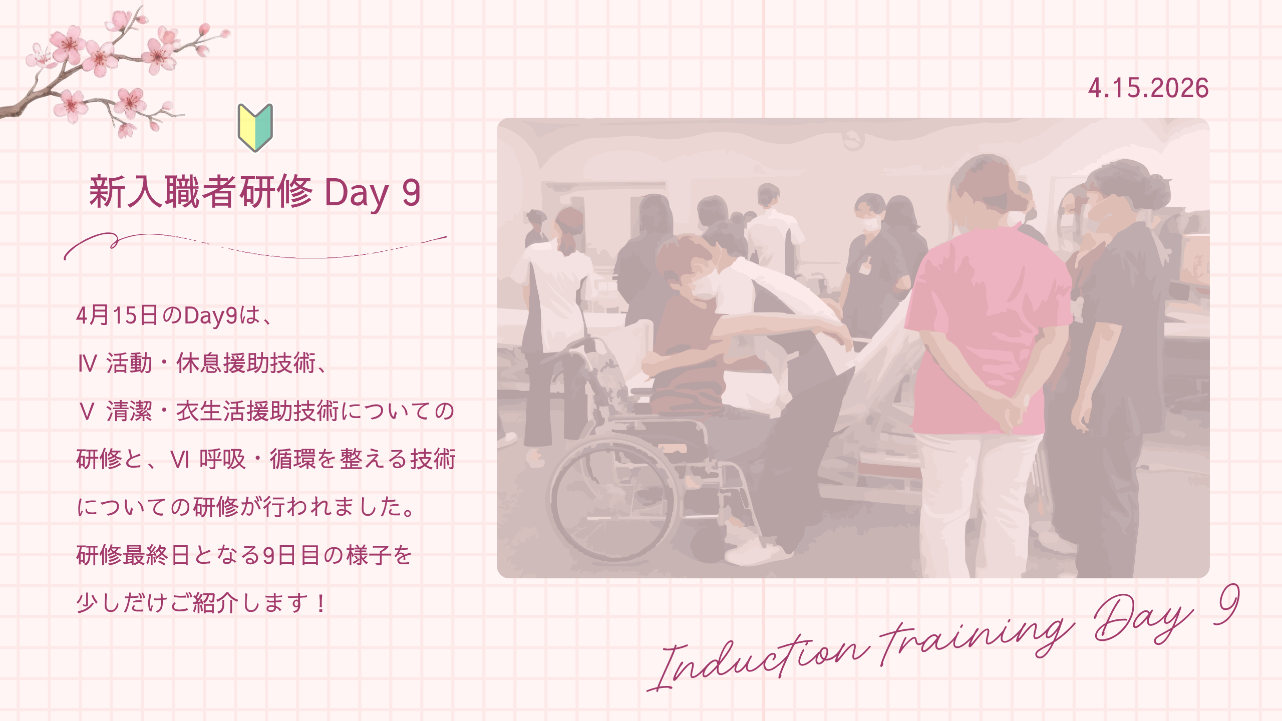 今年度の新入職者はとても元気があり、すでに評判となるほど活気のあるメンバーが揃っています。この2週間、毎日盛りだくさんの内容の中で、一生懸命に研修へ取り組む姿が印象的でした。本日で院内研修は最終日を迎え、明日は外部研修に参加予定です。その後、それぞれの部署へ配属となります。