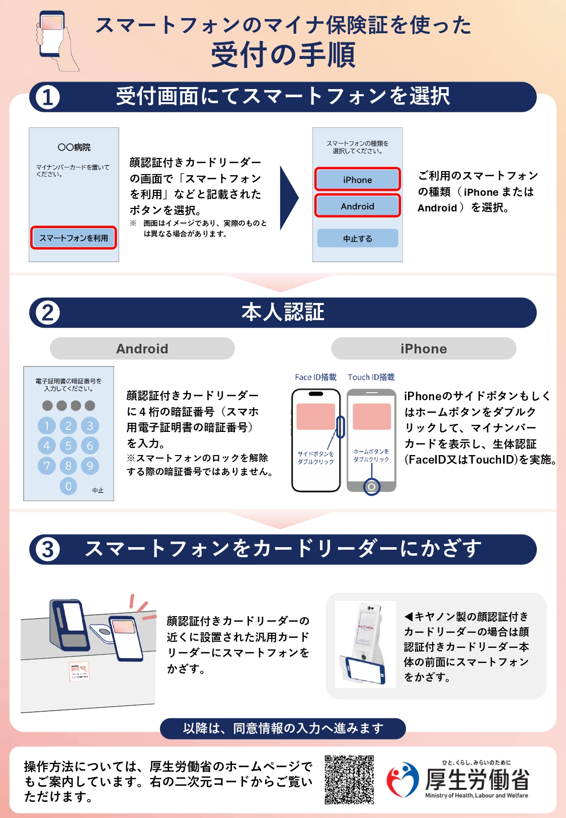 マイナンバーカードをお持ちの方は、受付窓口に設置しているカードリーダーを利用することで、保険の資格確認がスムーズにできます。