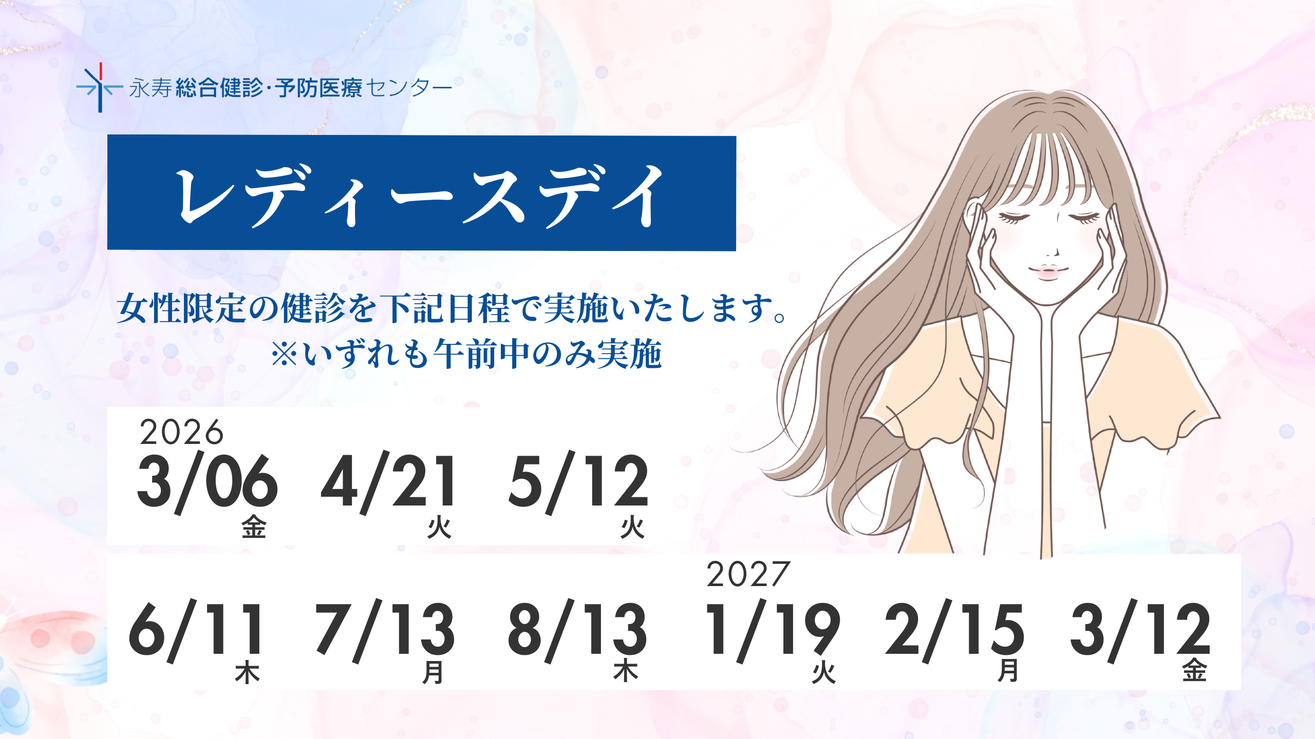 今年度のレディースデイは上記日程をもちまして終了となります。受診をご検討中の方はお早めにご予約ください。