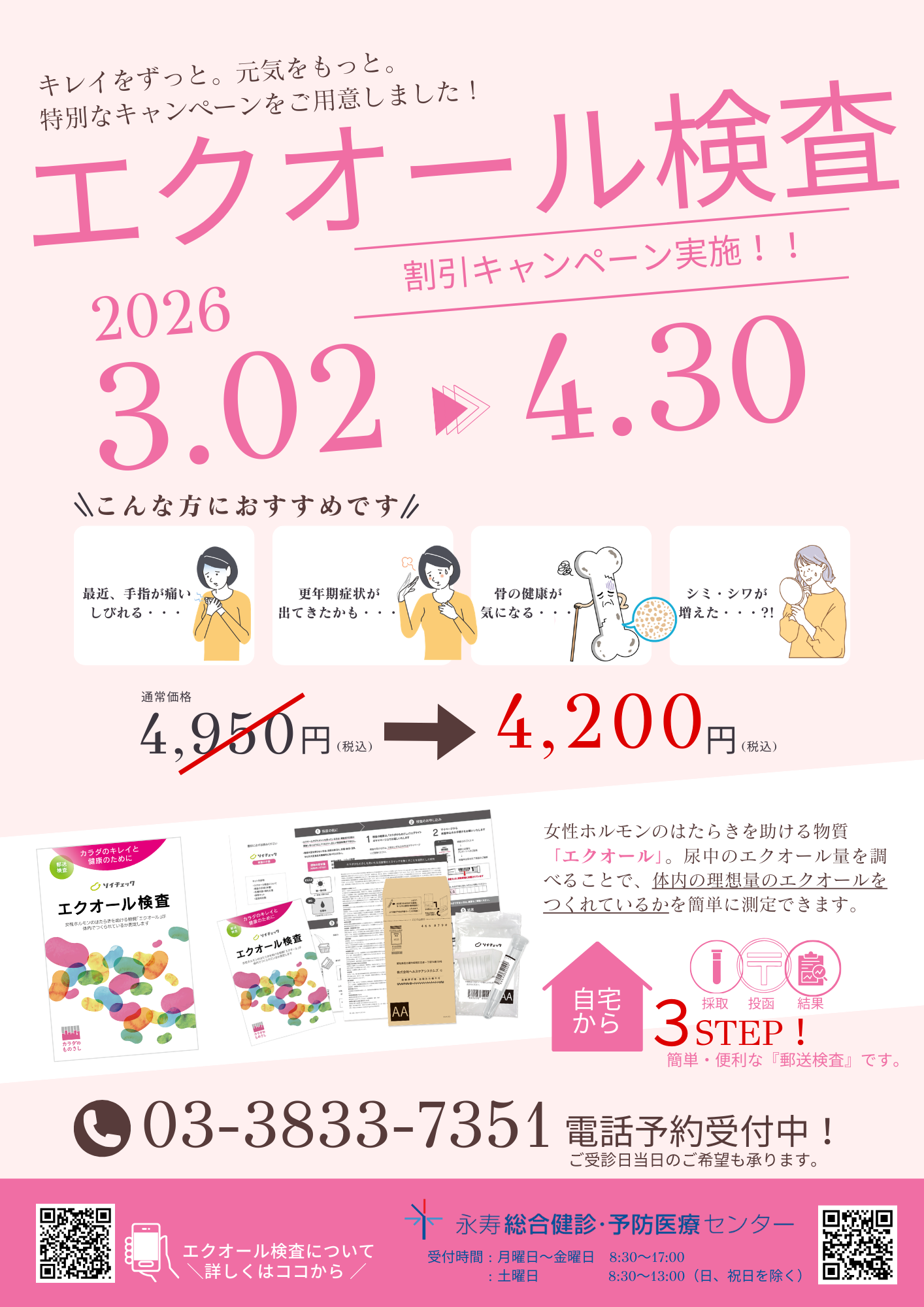「最近、体調の変化を感じやすくなった」「大豆製品を意識して摂っているけれど、効果があるのかな?」そんな女性の健やかな毎日をサポートするため、当センターでは「エクオール検査(ソイチェック)」の割引キャンペーンを実施いたします。