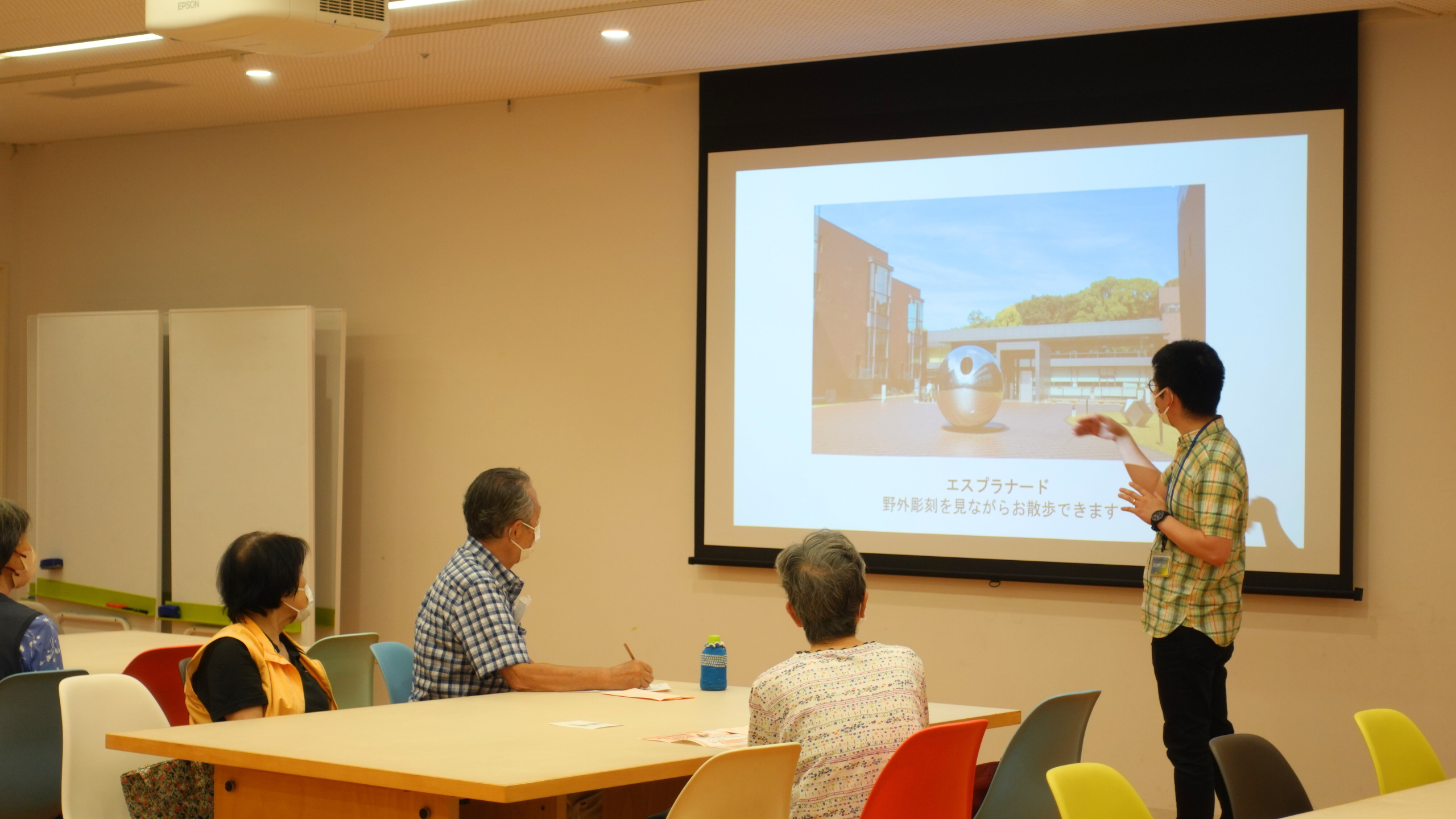 今回のオレンジカフェでは、美術館スタッフの方からの素敵なご提案により、「アクティブ・アート鑑賞」からスタートしました。参加者の皆様に万歩計をつけていただき、歴史ある佐藤慶太郎アートラウンジを見学したり、美術館の外にある彫刻作品を鑑賞したりと、まずは身体を動かしながら館内を散策する時間を取りました。