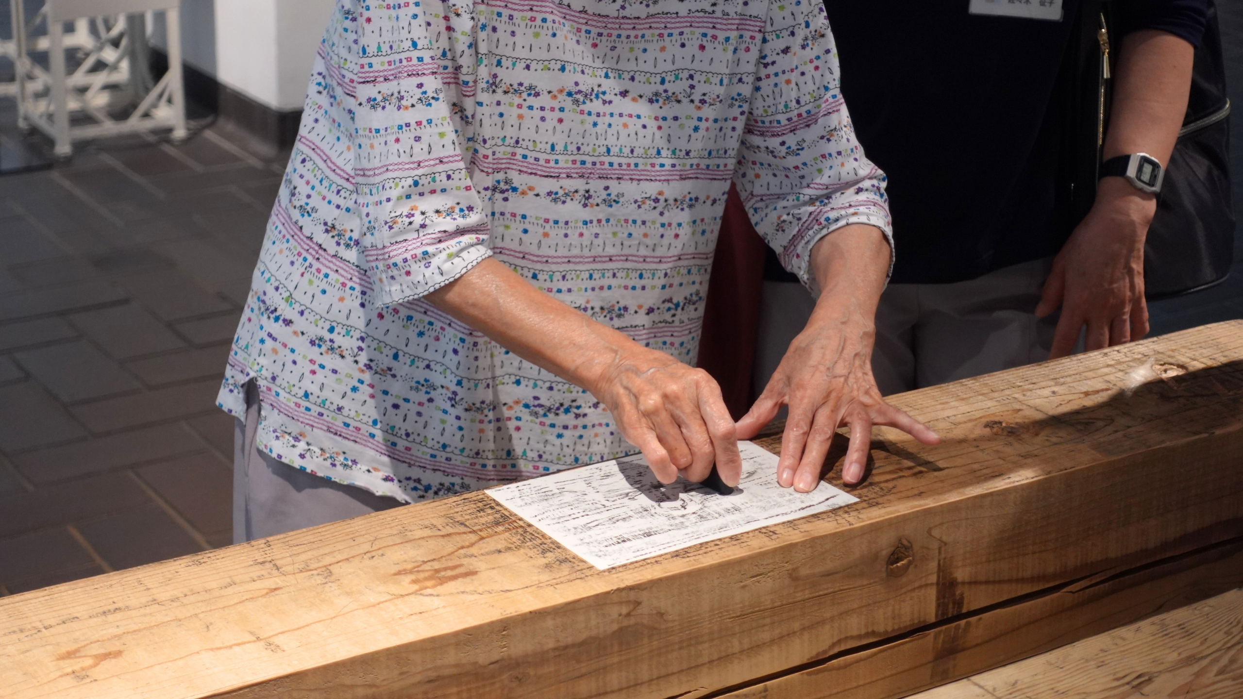 これは「DIYについて考え、実際に手を動かして体験できる」コーナーであり、皆様は大変積極的に活動されていました。木材に紙を置いて木目を鉛筆でなぞるフロッタージュ体験では、それぞれの木の個性や質感を発見する喜びを味わい、また、箱の中に手を入れ、中身を触って予想したものをもう一人の人が絵に起こすコミュニケーションのワークショップでも、皆様は笑顔で熱中されていました。