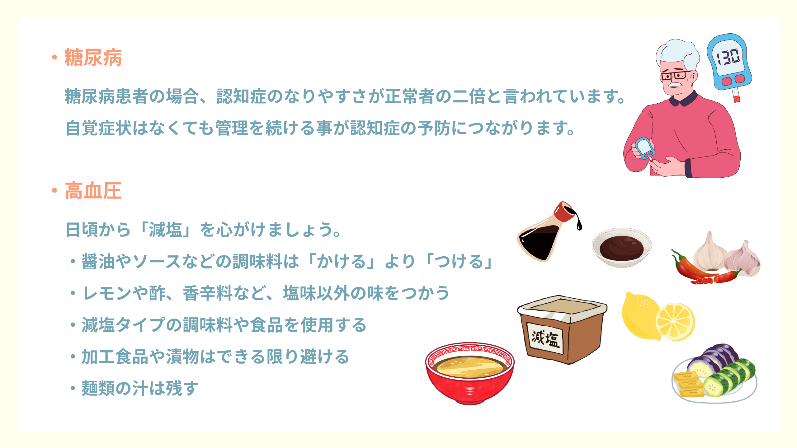 「生活習慣病は認知症になりやすい」という研究結果があり、特に「糖尿病」と「高血圧」には注意が必要です。