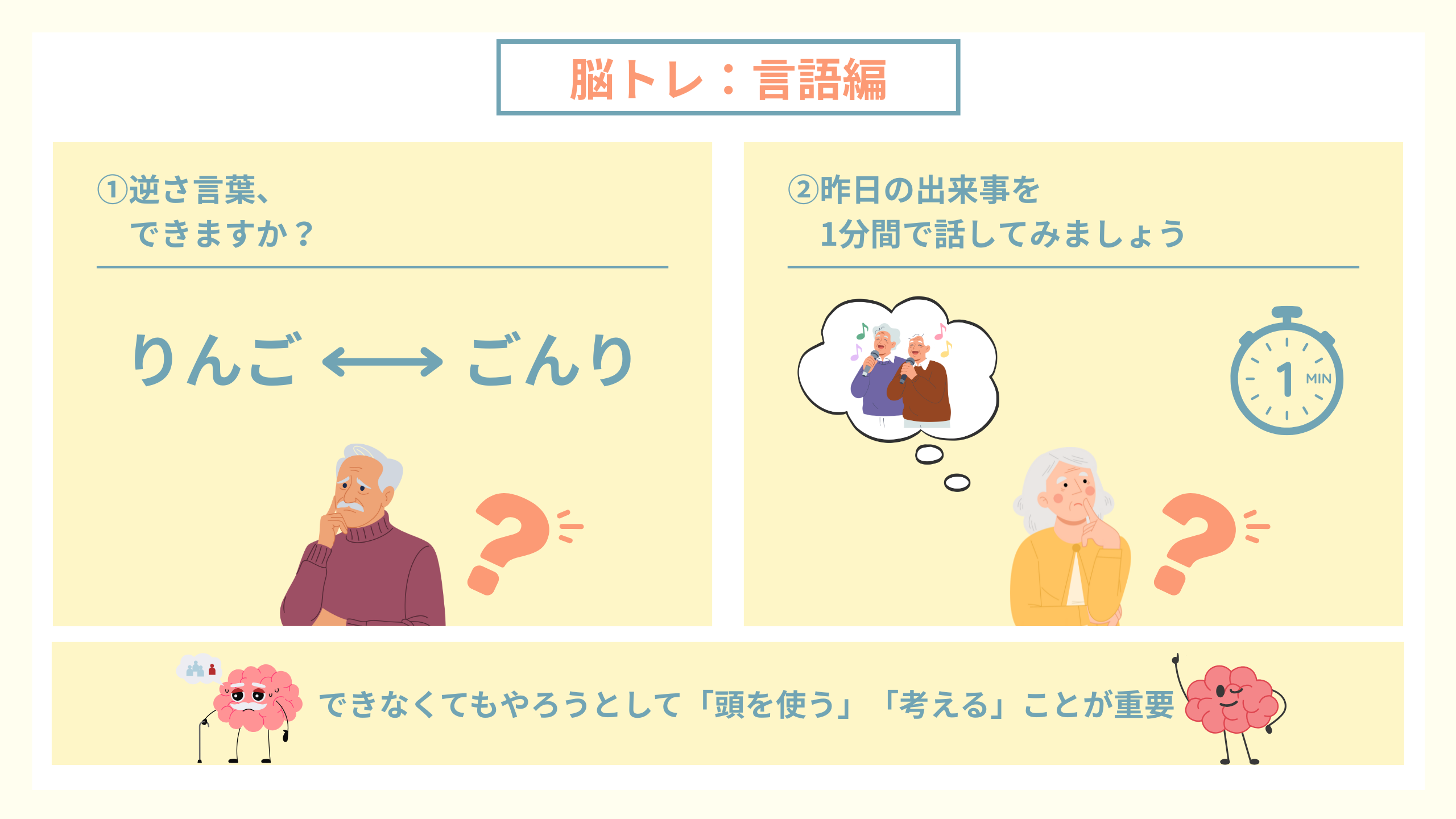 “逆さに言う”“足を動かす”“リズムに合わせる”という複数の動きを組み合わせることで、脳への刺激が高まります。