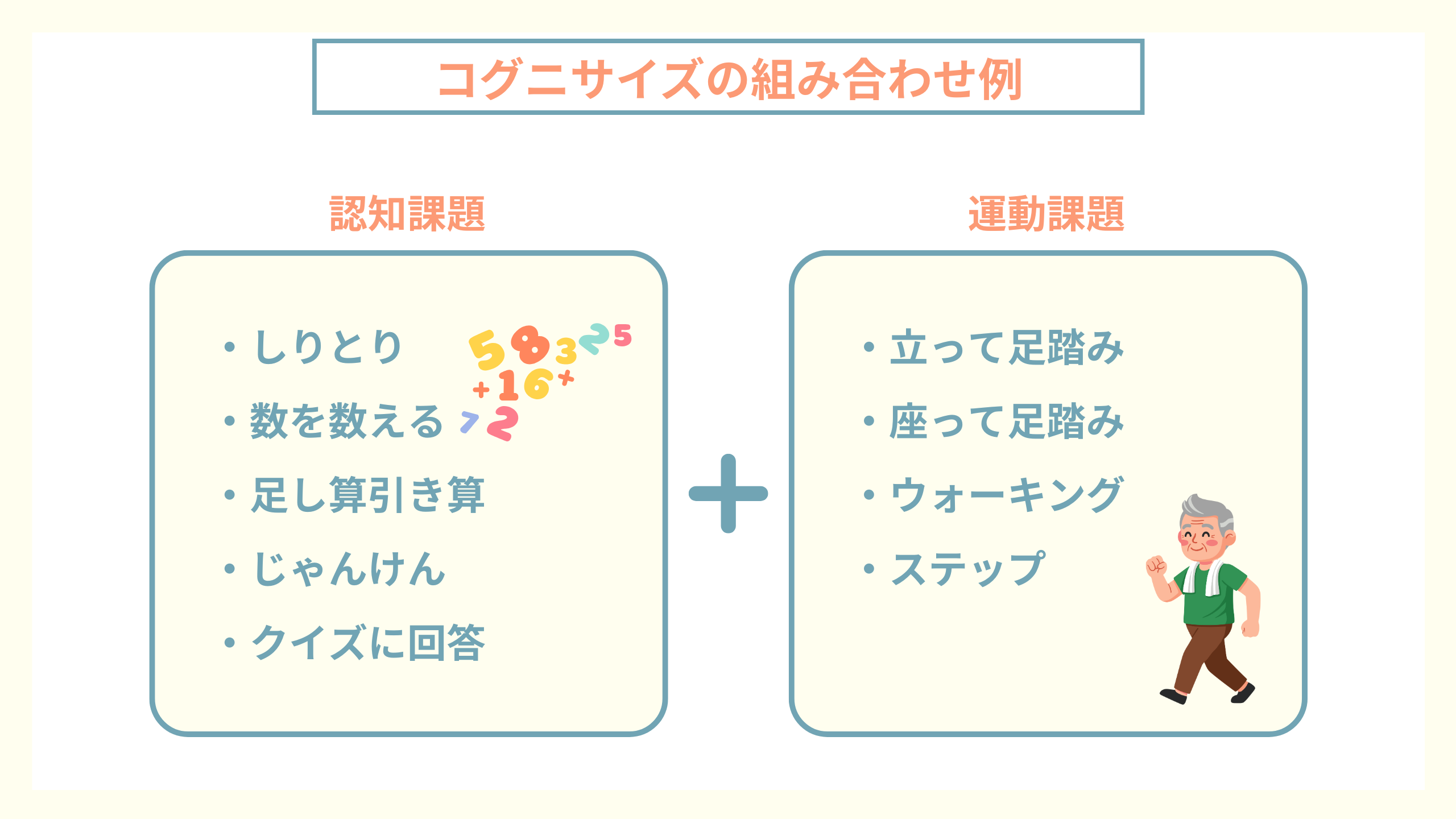 認知(cognition=コグニション)と運動(exercise)を組み合わせた造語で『コグニサイズ』は、認知課題と運動課題を組み合わせた体操のことです。