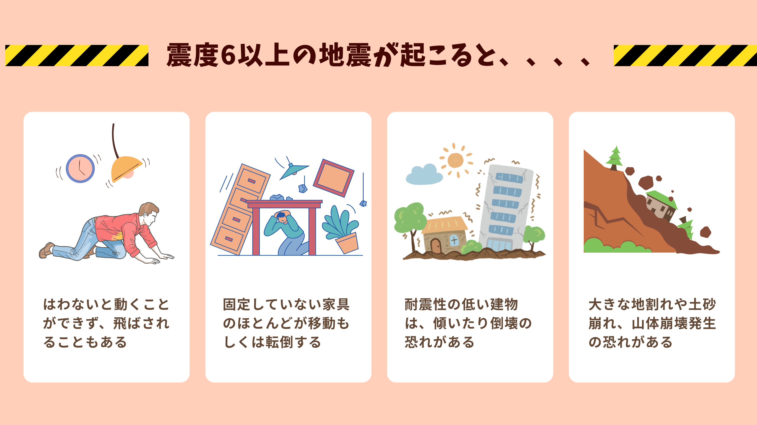 震度6以上の地震が起こると、下記のような状況が想定されます。