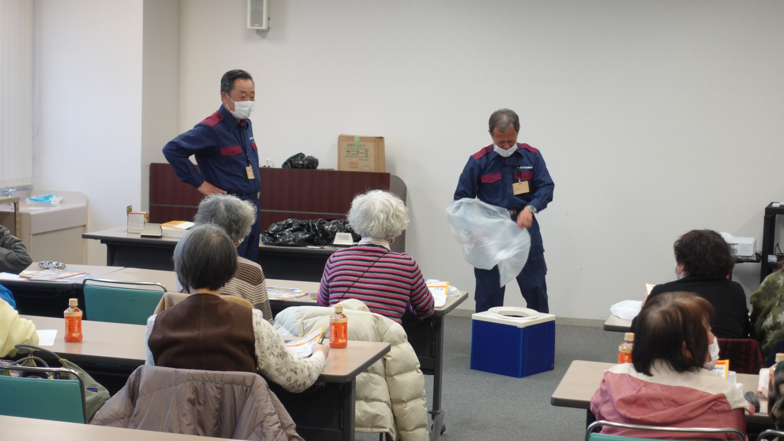 また、自宅のトイレを簡易トイレとして使用する方法を実演していただきました。排泄物にふりかけて固め、脱臭作用もある粉末は100円ショップでも手に入るとのこと。身近なものを活用し、無理なく備える工夫が印象的でした。