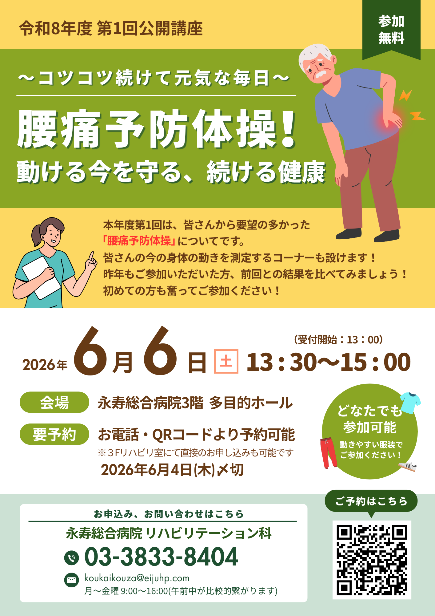 今年度の第1回は、皆様からのご要望が多かった「腰痛予防体操」をテーマに実施いたします。