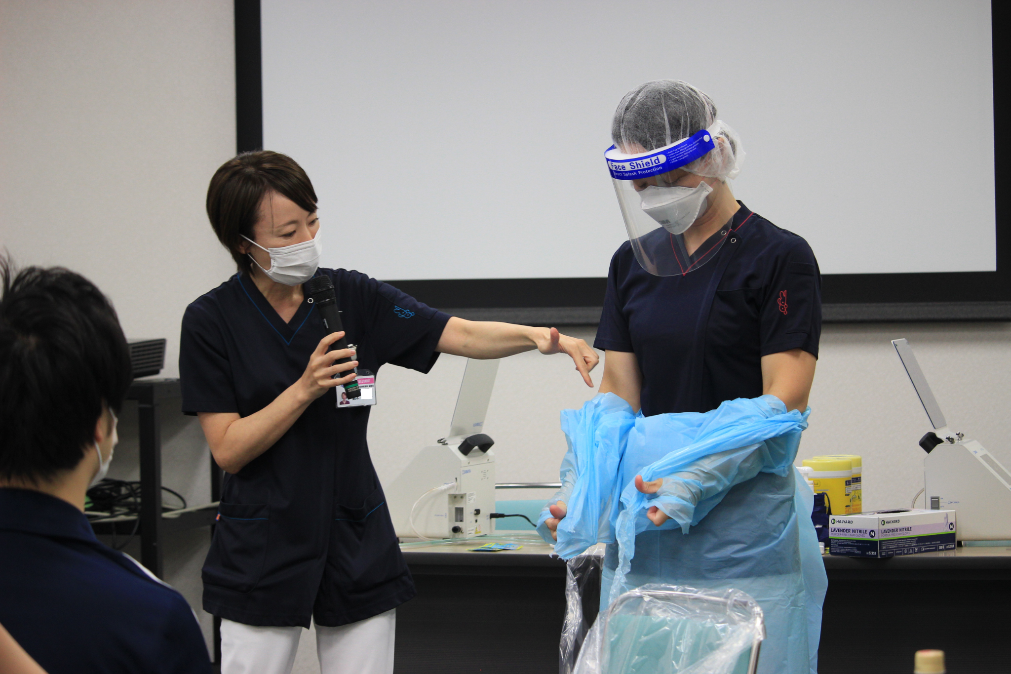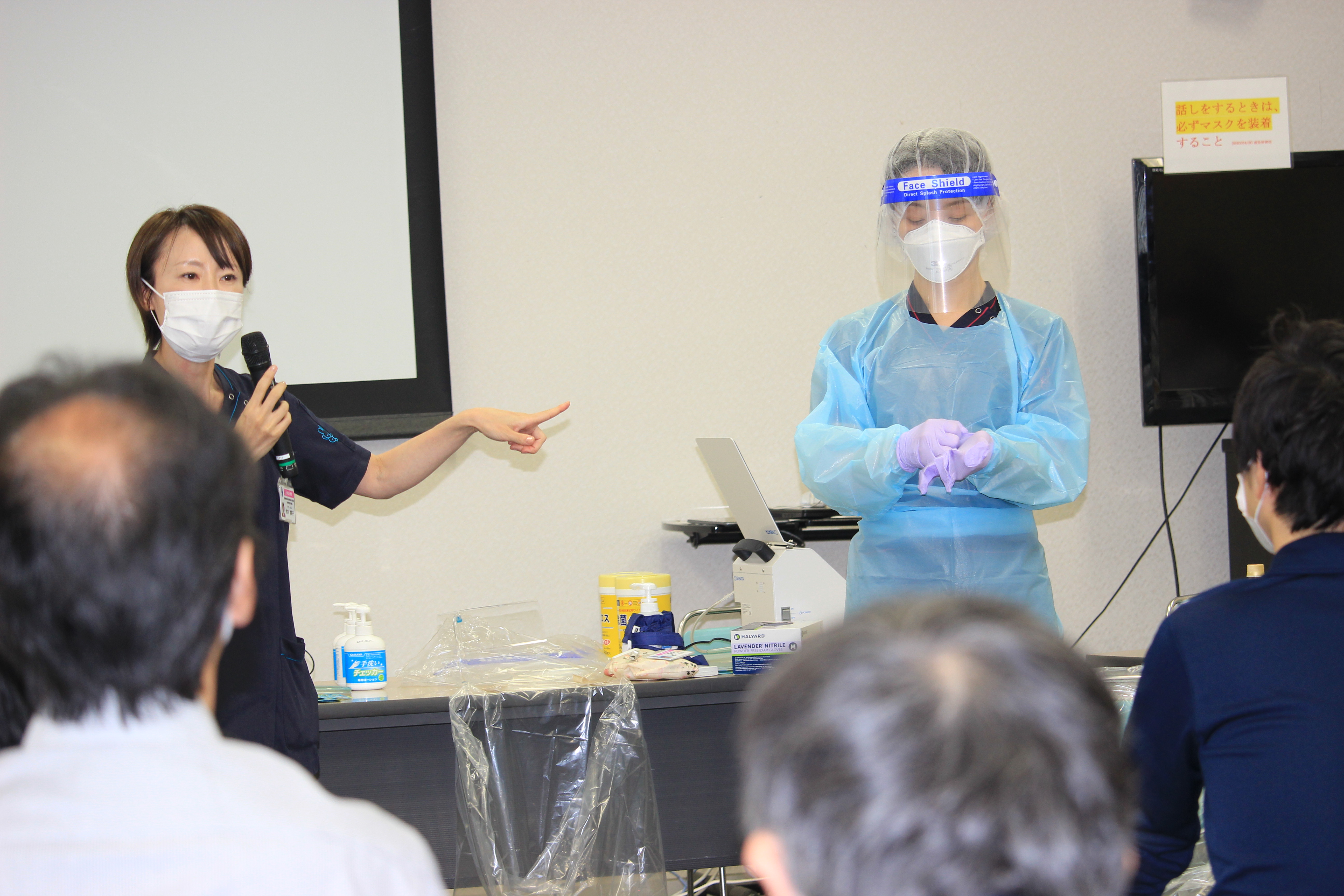 まずは、PPE着脱の一連の流れを演習を交えて説明しました。