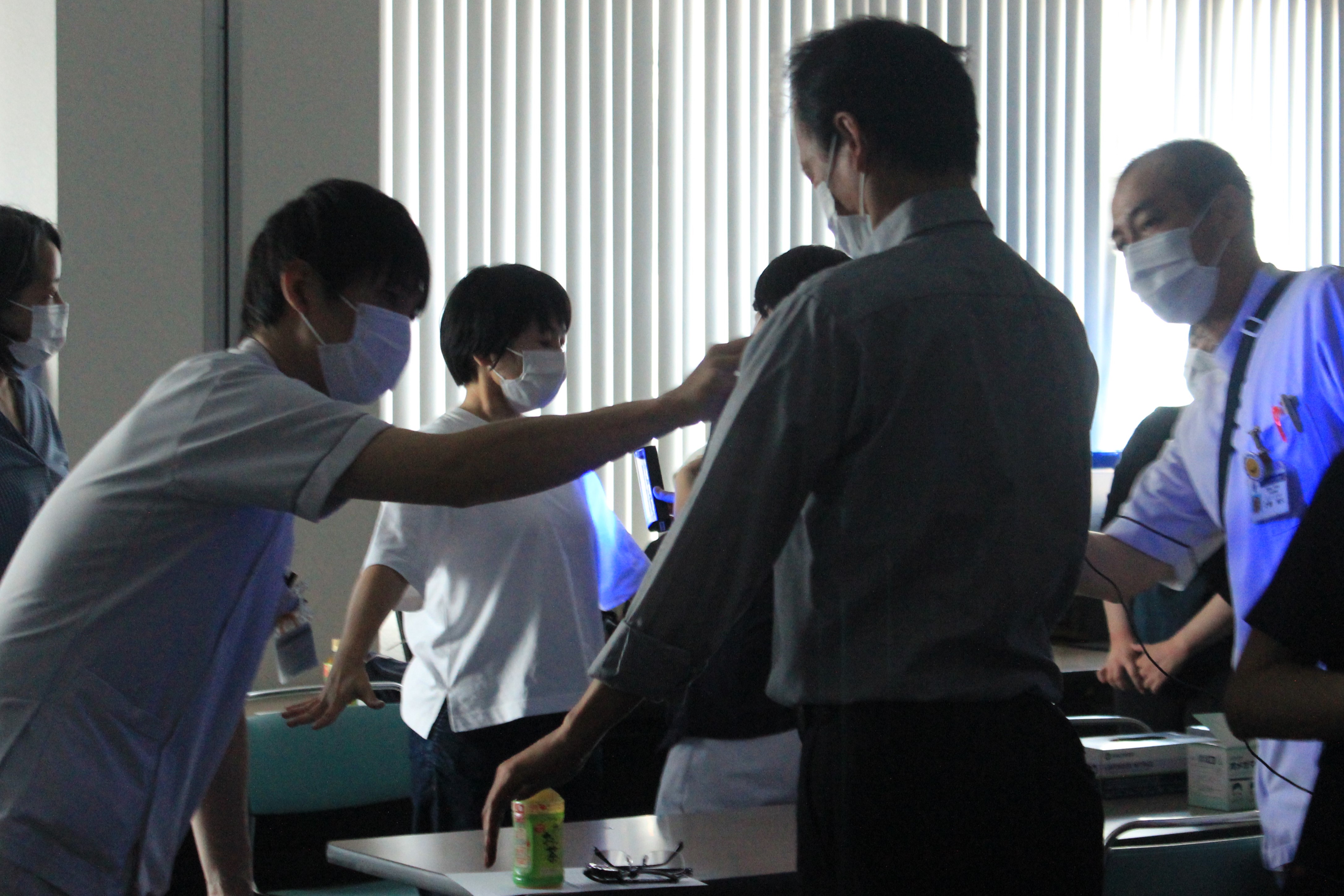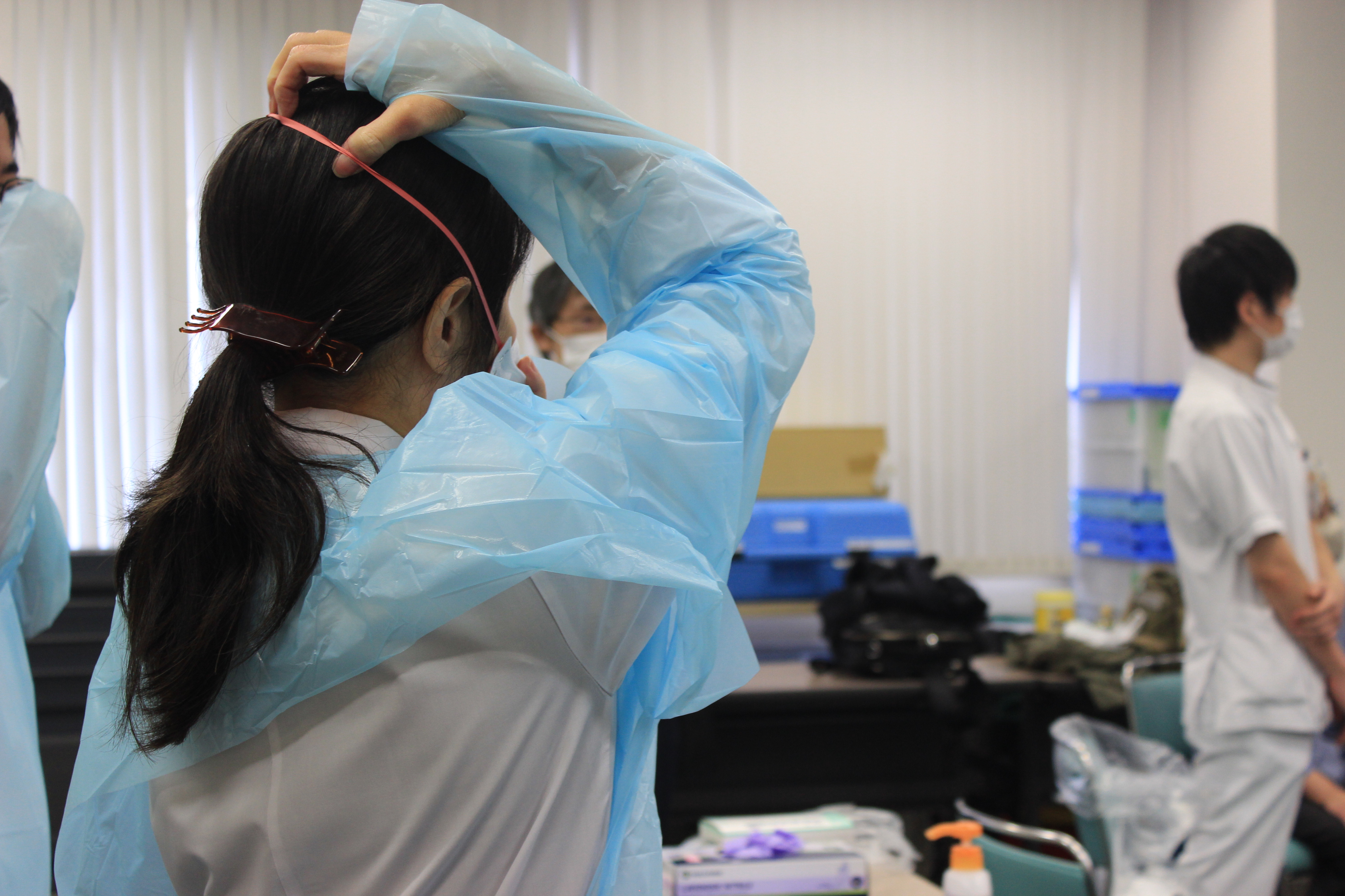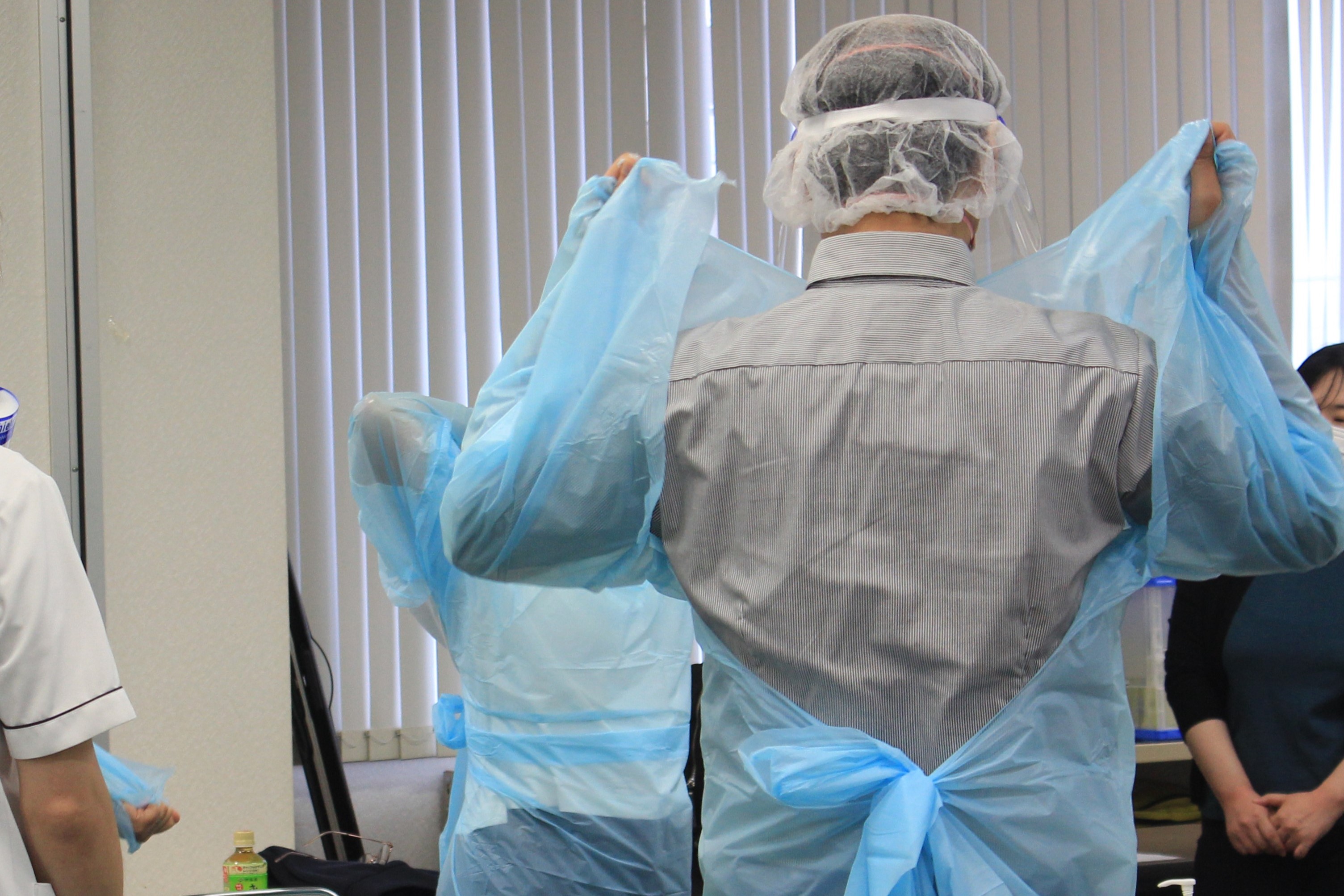 お手本の後は、ご参加いただいた方々に、PPE着脱訓練をして頂きました。