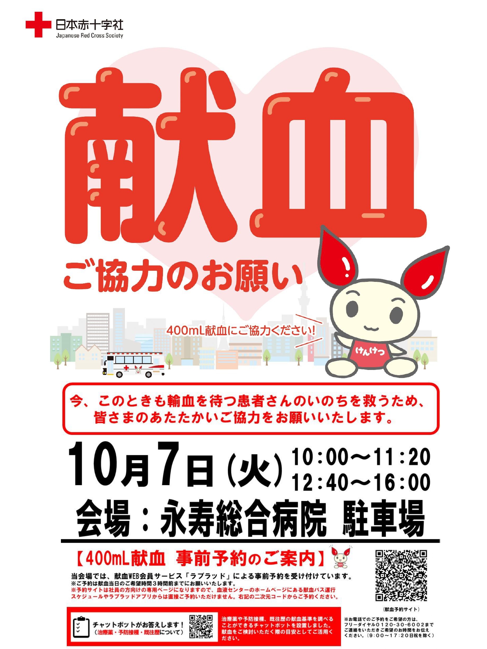 ご予約は、下記QRの献血予約サイトから、献血当日のご希望時間3時間前まで可能です。