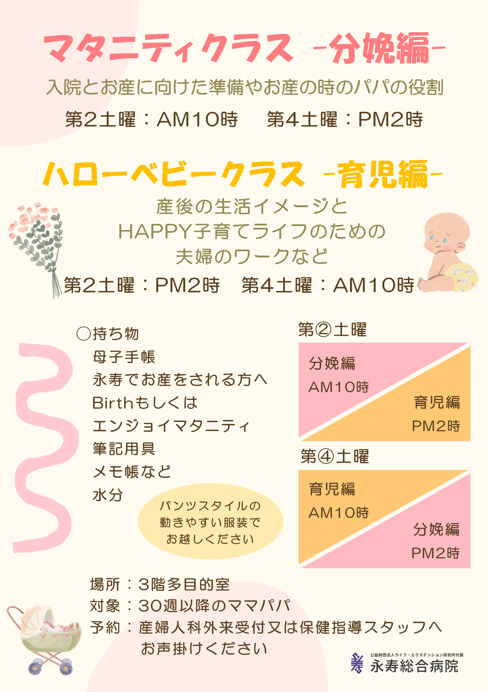 出産を控えるママとそのご家族が赤ちゃんを安心して迎えられるよう、マタニティクラス・ハローベビークラスを開催しております。