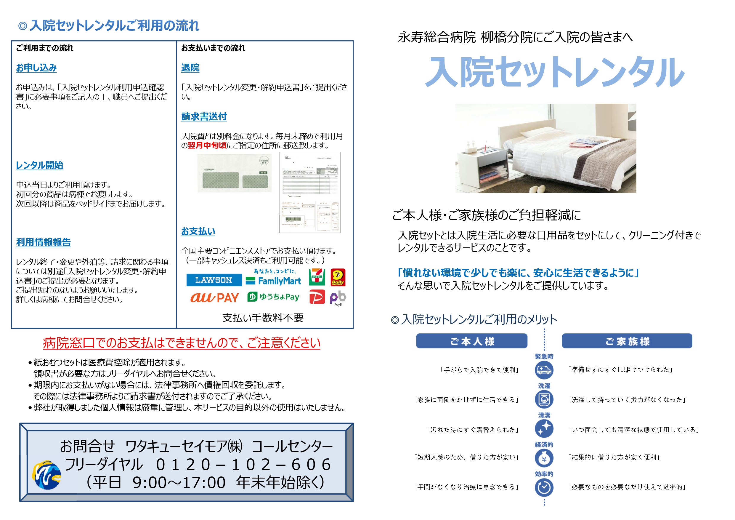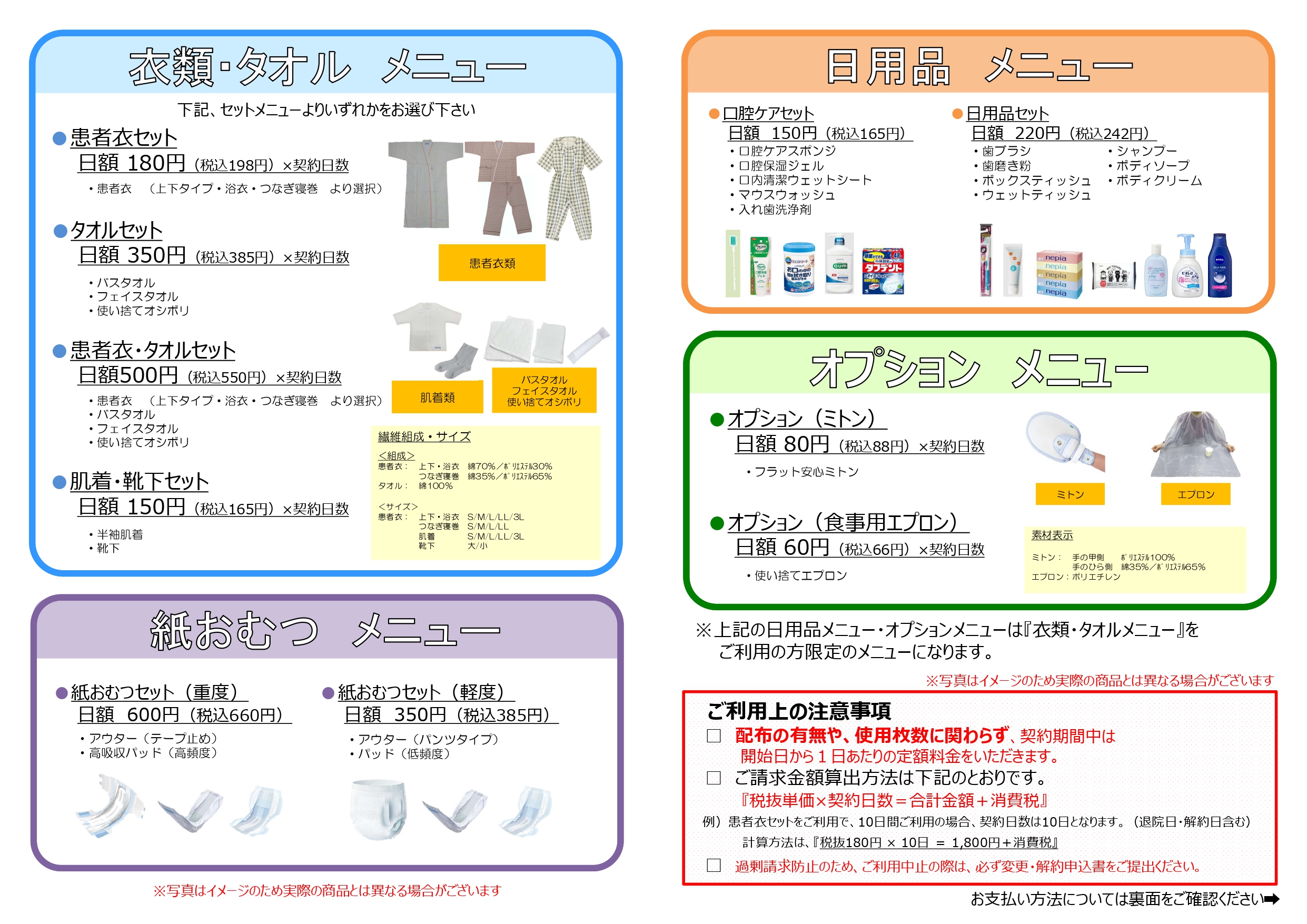 この度、当院では院内外の感染予防対策および衛生管理の強化並びに、入院患者様・ご家族様への更なるサービス向上と、ご家族様の負担軽減を目的として、2025年12月1日(月)より新入院セットを導入させていただくことになりました。