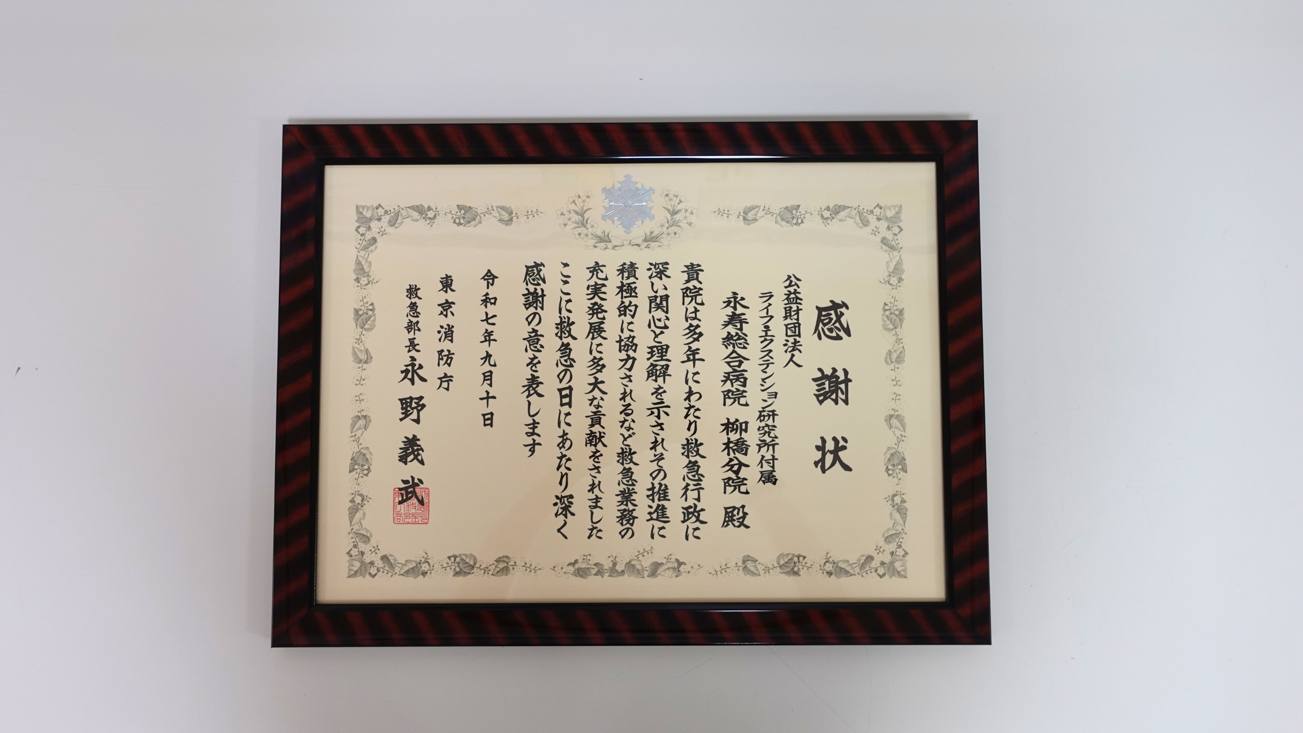 当院の柳橋分院は、多年にわたり救急行政に深い関心と理解を示し、その推進に積極的に協力した功績が認められました。このたび「救急の日」にあたり、令和7年9月10日付で東京消防庁より感謝状が授与されました。感謝状には、救急業務の充実発展に多大な貢献をしたことへの謝意が記されています。当院は、今後も地域の救急体制強化に協力し、安心安全な医療提供に努めてまいります。